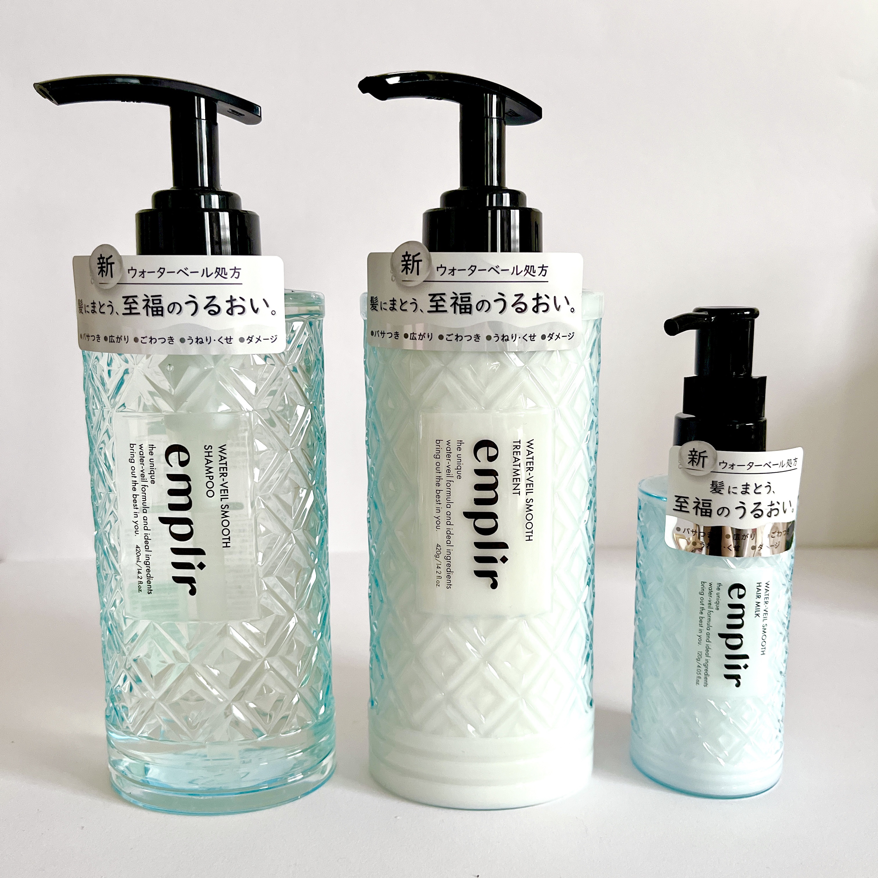 emplir/・ウォーターベールスムースシャンプー・ウォーターベールスムーストリートメント・ウォーターベール、スムースヘアミルクを使ってみました貯水美髪シャンプー&トリートメント&ヘアミルク🔹サラサラタイプ🔹フリー処方90%以上、保湿・補修成...