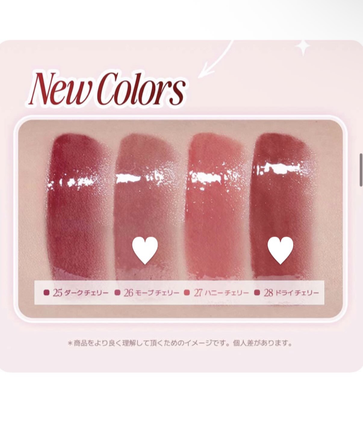 - <01 ビンテージアップル(VINTAGE APPLE)> リンゴ酸ジイソステアリル、水、ビスジグリセリルポリアシルアジペート-2、トリメチルシロキシフェニルジメチコン、水添ポリイソブテン、ダイマージリノール酸ダイマージリノレイルビス(ベヘニル/イソステアリル/フィトステリル)、ポリフェニルシルセスキオキサン、ジグリセリン、セチルPEG/PPG-10/1ジメチコン、ポリソルベート60、セテアレス-20、1,2-ヘキサンジオール、(アクリル酸ヒドロキシエチル/アクリロイルジメチルタウリンNa)コポリマー、スクワラン、ベヘニルアルコール、フェノキシエタノール、カプリリルグリコール、酸化チタン、黄5、赤227、香料、イソステアリン酸ソルビタン、水酸化Al、ポリアクリル酸アンモニウム、青1、BG、トリ(カプリル酸/カプリン酸)グリセリル、テトラ(ジ-t-ブチルヒドロキシヒドロケイヒ酸)ペンタエリスリチル、バラエキス <02 サマーアプリコット(SUMMER APRICOT)> リンゴ酸ジイソステアリル、水、ビスジグリセリルポリアシルアジペート-2、トリメチルシロキシフェニルジメチコン、水添ポリイソブテン、ダイマージリノール酸ダイマージリノレイルビス(ベヘニル/イソステアリル/フィトステリル)、ポリフェニルシルセスキオキサン、ジグリセリン、セチルPEG/PPG-10/1ジメチコン、ポリソルベート60、セテアレス-20、1,2-ヘキサンジオール、(アクリル酸ヒドロキシエチル/アクリロイルジメチルタウリンNa)コポリマー、スクワラン、ベヘニルアルコール、フェノキシエタノール、酸化チタン、カプリリルグリコール、香料、黄4、黄5、赤227、イソステアリン酸ソルビタン、水酸化Al、ポリアクリル酸アンモニウム、赤104(1)、BG、青1、トリ(カプリル酸/カプリン酸)グリセリル、テトラ(ジ-t-ブチルヒドロキシヒドロケイヒ酸)ペンタエリスリチル、バラエキス <03 ブラッシュドピーチ(BLUSHED PEACH)> リンゴ酸ジイソステアリル、水、ビスジグリセリルポリアシルアジペート-2、トリメチルシロキシフェニルジメチコン、ダイマージリノール酸ダイマージリノレイルビス(ベヘニル/イソステアリル/フィトステリル)、水添ポリイソブテン、ポリフェニルシルセスキオキサン、ジグリセリン、セチルPEG/PPG-10/1ジメチコン、ポリソルベート60、セテアレス-20、1,2-ヘキサンジオール、(アクリル酸ヒドロキシエチル/アクリロイルジメチルタウリンNa)コポリマー、スクワラン、ベヘニルアルコール、フェノキシエタノール、酸化チタン、カプリリルグリコール、香料、赤227、イソステアリン酸ソルビタン、黄4、黄5、水酸化Al、ポリアクリル酸アンモニウム、BG、トリ(カプリル酸/カプリン酸)グリセリル、テトラ(ジ-t-ブチルヒドロキシヒドロケイヒ酸)ペンタエリスリチル、バラエキス <04 ペールプラム(PALE PLUM)> リンゴ酸ジイソステアリル、水、ビスジグリセリルポリアシルアジペート-2、トリメチルシロキシフェニルジメチコン、水添ポリイソブテン、ダイマージリノール酸ダイマージリノレイルビス(ベヘニル/イソステアリル/フィトステリル)、ポリフェニルシルセスキオキサン、ジグリセリン、セチルPEG/PPG-10/1ジメチコン、ポリソルベート60、セテアレス-20、1,2-ヘキサンジオール、(アクリル酸ヒドロキシエチル/アクリロイルジメチルタウリンNa)コポリマー、スクワラン、ベヘニルアルコール、酸化チタン、フェノキシエタノール、カプリリルグリコール、香料、黄5、赤227、イソステアリン酸ソルビタン、黄4、赤104(1)、水酸化Al、ポリアクリル酸アンモニウム、酸化鉄、青1、BG、トリ(カプリル酸/カプリン酸)グリセリル、テトラ(ジ-t-ブチルヒドロキシヒドロケイヒ酸)ペンタエリスリチル、バラエキス <05 フレッシュチェリー(FRESH CHERRY)> リンゴ酸ジイソステアリル、水、ビスジグリセリルポリアシルアジペート-2、トリメチルシロキシフェニルジメチコン、水添ポリイソブテン、ダイマージリノール酸ダイマージリノレイルビス(ベヘニル/イソステアリル/フィトステリル)、ポリフェニルシルセスキオキサン、ジグリセリン、セチルPEG/PPG-10/1ジメチコン、ポリソルベート60、セテアレス-20、1,2-ヘキサンジオール、(アクリル酸ヒドロキシエチル/アクリロイルジメチルタウリンNa)コポリマー、スクワラン、ベヘニルアルコール、フェノキシエタノール、カプリリルグリコール、赤227、香料、黄4、赤104(1)、イソステアリン酸ソルビタン、黄5、青1、BG、トリ(カプリル酸/カプリン酸)グリセリル、テトラ(ジ-t-ブチルヒドロキシヒドロケイヒ酸)ペンタエリスリチル、バラエキス <06 デイリーモーブ(DAILY MAUVE)> リンゴ酸ジイソステアリル、水、ビスジグリセリルポリアシルアジペート-2、トリメチルシロキシフェニルジメチコン、水添ポリイソブテン、ダイマージリノール酸ダイマージリノレイルビス(ベヘニル/イソステアリル/フィトステリル)、ポリフェニルシルセスキオキサン、ジグリセリン、セチルPEG/PPG-10/1ジメチコン、ポリソルベート60、セテアレス-20、1,2-ヘキサンジオール、(アクリル酸ヒドロキシ