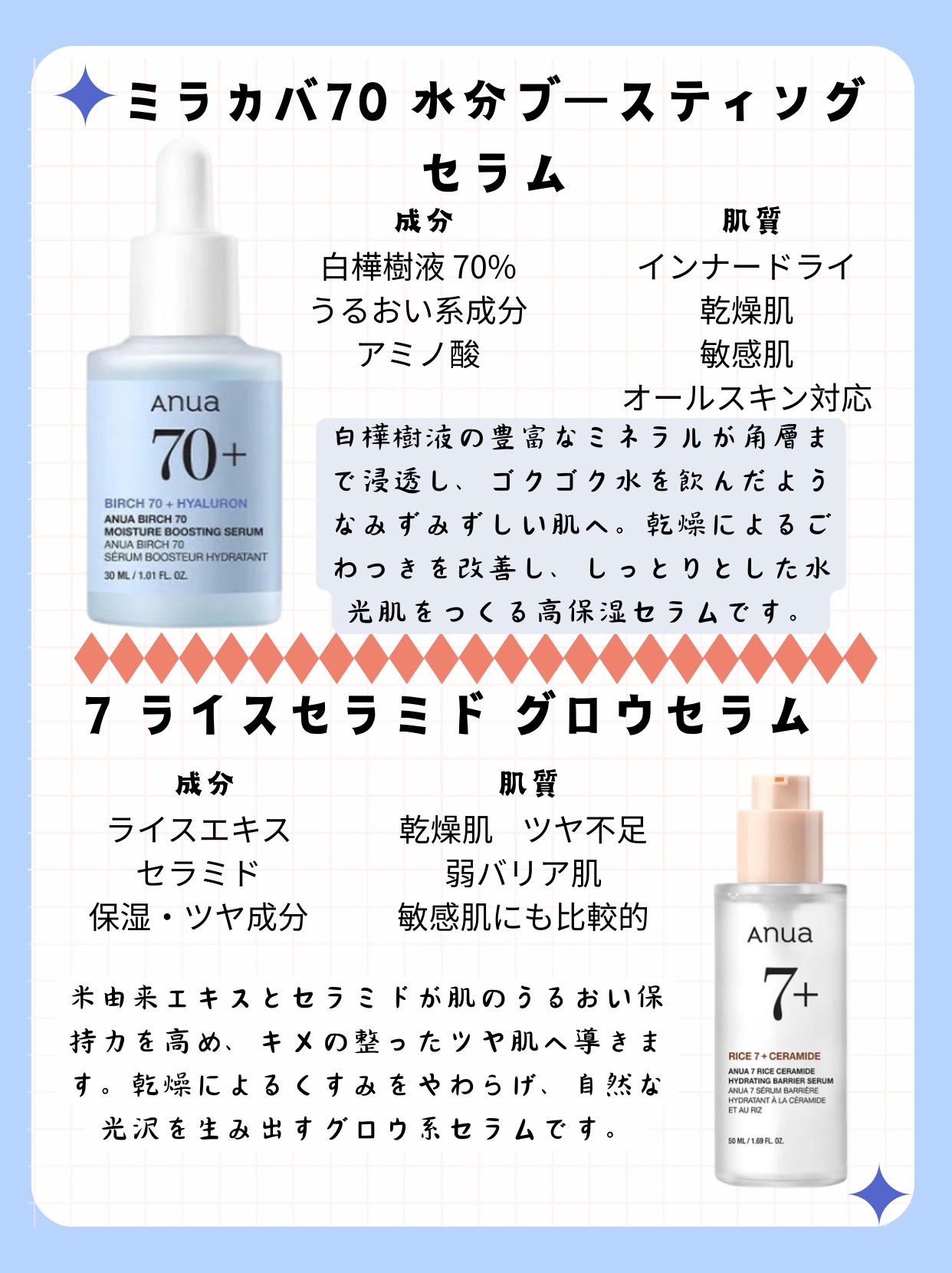 🦋夏の肌トラブル、何でケアする?🌞肌悩み別・Anua美容液まとめ💧気温も湿度も上がる夏は、肌が不安定になりがち🥵そんなときこそ、“効かせる美容液”で集中ケアが鍵!✔テカリ・毛穴・ゆらぎ・紫外線…それぞれに合う1本を紹介✔どれもベタつかない!夏...