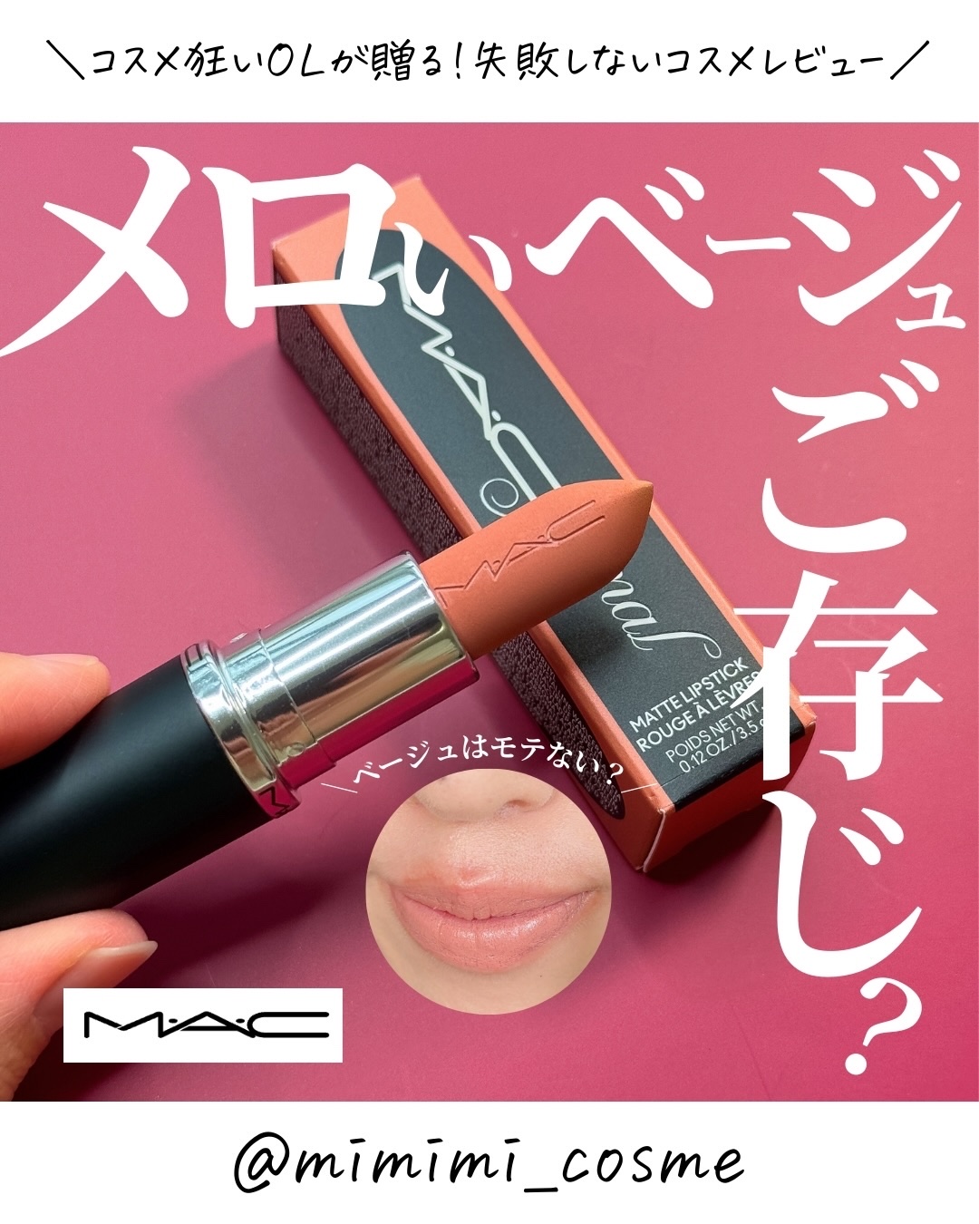 - <価格改定>2025年7月1日より¥4,620(税込)から¥4,400(税込)に改定いたします。 マットリップはここまで進化。 色もち12時間*続くのに乾燥レスな新感覚 ”オイルinマット” M・A・Cのマキシマル誕生。 毎日つけたくなるような、 バームのようななめらかな質感とつけ心地が12時間持続*。 ありのままの自分から、 さらに一歩先へ踏み出せるような自信を唇に *化粧持ち(色持ち)データ取得済み。(当社調べ。効果には個人差があります。) ①リッチな発色とカラーラインナップ M・A・C独自のテクノロジー、リッチピグメントフォーミュラにより鮮やかな発色を実現。 人気色を継続しながらも、新たにアーティストが厳選した25シェードは、 一人一人の個性やスタイル、魅力を高め、存在感を放つit カラーをラインナップ。 ②ストレスフリーなつけ心地 マットテクスチャー=乾燥しやすいというネガティブイメージを払拭する、オイル in マット フォーミュラ。 自然由来のオーガニックのシアバター、ココアバター、ココナッツオイル配合**で濃密な潤いを与え、驚きのなめらかな付け心地とフィット感を叶えた。 香りは、シグネチャーであるバニラを継続。 **シアバター:シア脂(保湿成分) 、ココアバター:カカオ脂(保湿成分) 、ココナッツオイル:ヤシ油(保湿成分) ③12時間持続*というラスティング力 ピタリと唇に密着しながらもしなやかに寄り添い、鮮やかな発色、つけ心地が12時間*持続。 唇をティントのように染めずに、それでいてどんな瞬間も自信の持てる唇に。 *化粧もちデータ取得済み (当社調べ、効果には個人差があります) ④魅力的な新パッケージ 再生プラスチックを約30%採用した、環境にやさしい新パッケージへとパワーアップ。 程よく重厚感のある感触はラグジュアリーな気持ちを高めてくれる。 また、リップにはM・A・Cのエンボス加工も。