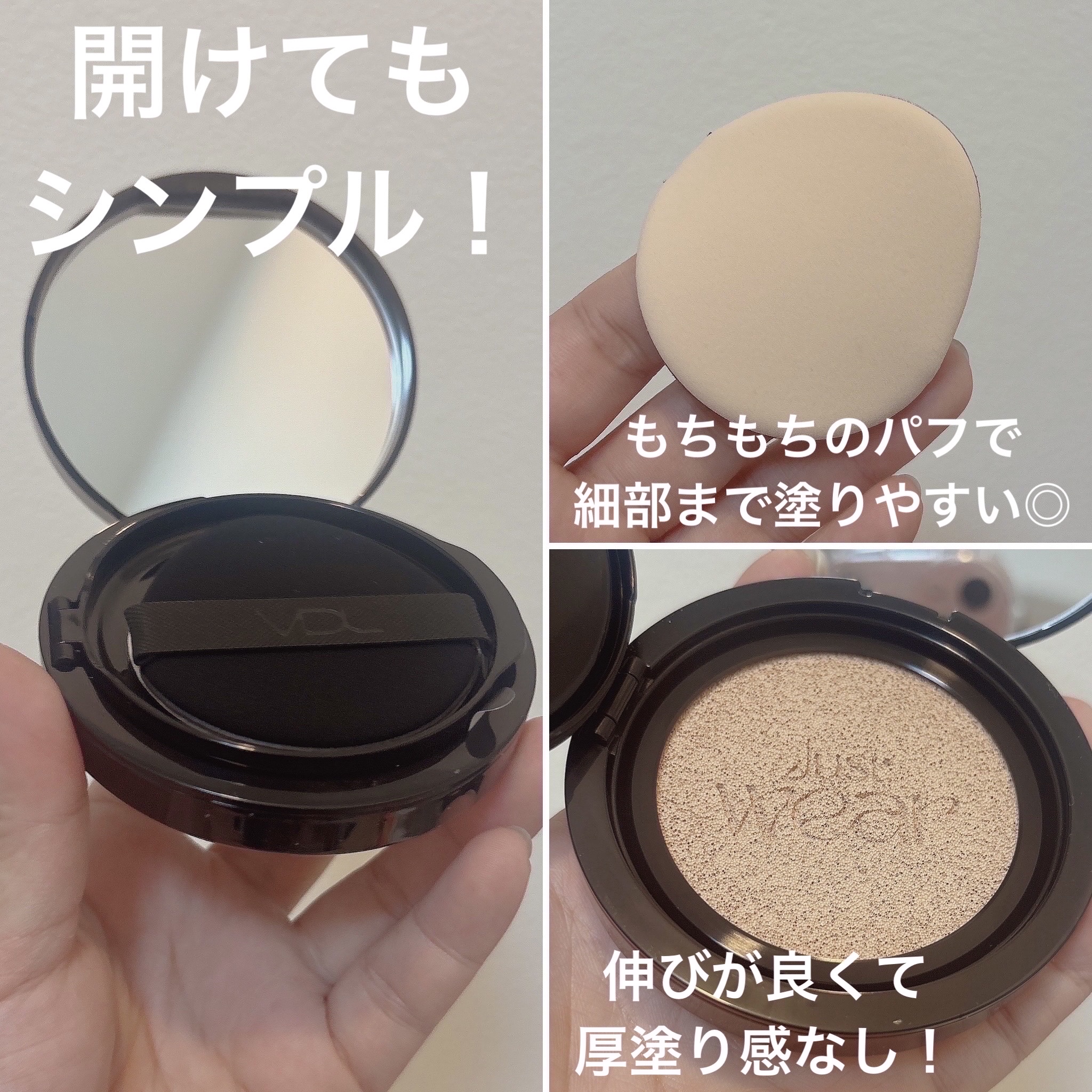 - SPF35・PA++ VDLで人気のファンデーション*1シリーズからクッションファンデーションが登場!! 24時間カバー*2 近距離でも美しく、0キョリ級クッション *1VDL カバーステイン パーフェクティング ファンデーション *2メイクアップカバー持続データ(小じわ、キメ、毛穴)韓国外部機関にて取得済み。効果には個人差があります。 Point1 崩れにくいロングラスティング効果 皮脂を吸着する多孔性シリカ*1と柔軟性があるポリマー*2配合。 メイクを維持し、崩れにくいカバー効果を与えます。 *1増量剤:シリカ *2皮膜形成剤:トリメチルシロキシケイ酸 Point2 0キョリ級クッション 少量ワンタッチで肌悩みを密着カバー!ソフトフォーカス効果*で肌全体をきれいにカバーし、近距離でもハリのあるなめらかでつるんとした肌を演出。 *光の散乱によって毛穴やシワを目立たなくみせる効果のこと Point3 もちふわパフ+シックなデザイン 薄くて柔らかく、肌に密着。 指にフィットする柔らかい素材&卵型なので、たたきやすく小鼻の隅々まで塗りやすい!きめ細かなコントロールが可能。 高級感あるオールブラックのデザインですっきりとした印象へ Point4 みずみずしく保つヴィーガンファンデーション*1&紫外線防止効果 ソルビトールから発酵工法で得られた天然保湿高分子*2配合。 水分を抱え込みみずみずしく保つ*3 。 SPF35・PA++の紫外線防止効果も! *1韓国ヴィーガン認証院認証 *2整肌成分:ビオサッカリドガムー1 *3スキンケア効果による