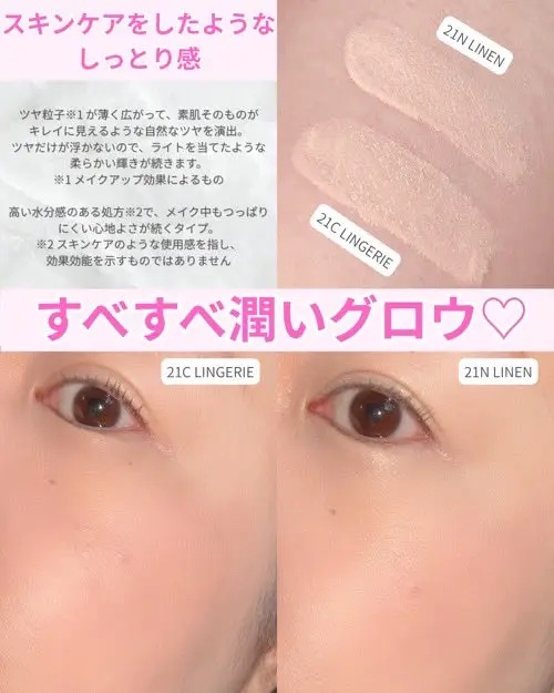 - <19C ライト(LIGHT)> 水、酸化チタン、ジフェニルシロキシフェニルトリメチコン、ホモサレート、サリチル酸エチルヘキシル、フェニルトリメチコン、トリメチルシロキシケイ酸、BG、ジ安息香酸PG、グリセリン、ラウリルPEG-10トリス(トリメチルシロキシ)シリルエチルジメチコン、(アクリレーツ/ジメチコン)コポリマー、ナイアシンアミド、セチルPEG/PPG-10/1ジメチコン、シクロペンタシロキサン、ポリメチルシルセスキオキサン、カミツレ水、ダマスクバラ花水、ジステアルジモニウムヘクトライト、シクロヘキサシロキサン、硫酸Mg、セスキオレイン酸ソルビタン、ジメチコン、1,2-ヘキサンジオール、トリベヘニン、(ベヘン酸/エイコサン二酸)グリセリル、トリエトキシカプリリルシラン、水酸化Al、(ジメチコン/ビニルジメチコン)クロスポリマー、カプリリルグリコール、香料、ジメチルシリル化シリカ、エチルヘキシルグリセリン、アデノシン、ヒアルロン酸Na、パンテノール、カエサルピニアスピノサ果実エキス、トコフェロール、カッパフィカスアルバレジエキス、テトラ(ジ-t-ブチルヒドロキシヒドロケイヒ酸)ペンタエリスリチル、ヒアルロン酸ヒドロキシプロピルトリモニウム、アセチルヒアルロン酸Na、加水分解ヒアルロン酸、ヒアルロン酸、ヒアルロン酸クロスポリマーNa、加水分解ヒアルロン酸Na、ヒアルロン酸K、酸化鉄 <21C ランジェリー(LINGERIE)> 水、酸化チタン、ジフェニルシロキシフェニルトリメチコン、ホモサレート、サリチル酸エチルヘキシル、フェニルトリメチコン、トリメチルシロキシケイ酸、BG、ジ安息香酸PG、グリセリン、ラウリルPEG-10トリス(トリメチルシロキシ)シリルエチルジメチコン、(アクリレーツ/ジメチコン)コポリマー、ナイアシンアミド、セチルPEG/PPG-10/1ジメチコン、シクロペンタシロキサン、ポリメチルシルセスキオキサン、ダマスクバラ花水、カミツレ水、ジステアルジモニウムヘクトライト、シクロヘキサシロキサン、硫酸Mg、セスキオレイン酸ソルビタン、ジメチコン、1,2-ヘキサンジオール、トリベヘニン、(ベヘン酸/エイコサン二酸)グリセリル、トリエトキシカプリリルシラン、水酸化Al、(ジメチコン/ビニルジメチコン)クロスポリマー、カプリリルグリコール、香料、ジメチルシリル化シリカ、エチルヘキシルグリセリン、アデノシン、ヒアルロン酸Na、パンテノール、カエサルピニアスピノサ果実エキス、トコフェロール、カッパフィカスアルバレジエキス、テトラ(ジ-t-ブチルヒドロキシヒドロケイヒ酸)ペンタエリスリチル、ヒアルロン酸ヒドロキシプロピルトリモニウム、アセチルヒアルロン酸Na、加水分解ヒアルロン酸、ヒアルロン酸、ヒアルロン酸クロスポリマーNa、加水分解ヒアルロン酸Na、ヒアルロン酸K、酸化鉄 <21N リネン(LINEN)> 水、酸化チタン、ジフェニルシロキシフェニルトリメチコン、ホモサレート、サリチル酸エチルヘキシル、フェニルトリメチコン、トリメチルシロキシケイ酸、BG、グリセリン、ジ安息香酸PG、ラウリルPEG-10トリス(トリメチルシロキシ)シリルエチルジメチコン、(アクリレーツ/ジメチコン)コポリマー、ナイアシンアミド、セチルPEG/PPG-10/1ジメチコン、シクロペンタシロキサン、ダマスクバラ花水、カミツレ水、ジステアルジモニウムヘクトライト、ポリメチルシルセスキオキサン、シクロヘキサシロキサン、硫酸Mg、セスキオレイン酸ソルビタン、ジメチコン、1,2-ヘキサンジオール、トリベヘニン、(ベヘン酸/エイコサン二酸)グリセリル、トリエトキシカプリリルシラン、水酸化Al、(ジメチコン/ビニルジメチコン)クロスポリマー、カプリリルグリコール、香料、ジメチルシリル化シリカ、エチルヘキシルグリセリン、アデノシン、ヒアルロン酸Na、パンテノール、カエサルピニアスピノサ果実エキス、トコフェロール、カッパフィカスアルバレジエキス、テトラ(ジ-t-ブチルヒドロキシヒドロケイヒ酸)ペンタエリスリチル、ヒアルロン酸ヒドロキシプロピルトリモニウム、ヒアルロン酸クロスポリマーNa、アセチルヒアルロン酸Na、ヒアルロン酸K、加水分解ヒアルロン酸Na、加水分解ヒアルロン酸、ヒアルロン酸、酸化鉄 <23N ジンジャー(GINGER)> 水、酸化チタン、ジフェニルシロキシフェニルトリメチコン、ホモサレート、サリチル酸エチルヘキシル、フェニルトリメチコン、トリメチルシロキシケイ酸、BG、ジ安息香酸PG、グリセリン、ラウリルPEG-10トリス(トリメチルシロキシ)シリルエチルジメチコン、(アクリレーツ/ジメチコン)コポリマー、ナイアシンアミド、セチルPEG/PPG-10/1ジメチコン、シクロペンタシロキサン、ダマスクバラ花水、カミツレ水、ジステアルジモニウムヘクトライト、シクロヘキサシロキサン、硫酸Mg、セスキオレイン酸ソルビタン、ジメチコン、1,2-ヘキサンジオール、トリベヘニン、(ベヘン酸/エイコサン二酸)グリセリル、ポリメチルシルセスキオキサン、トリエトキシカプリリルシラン、水酸化Al、(ジメチコン/ビニルジ