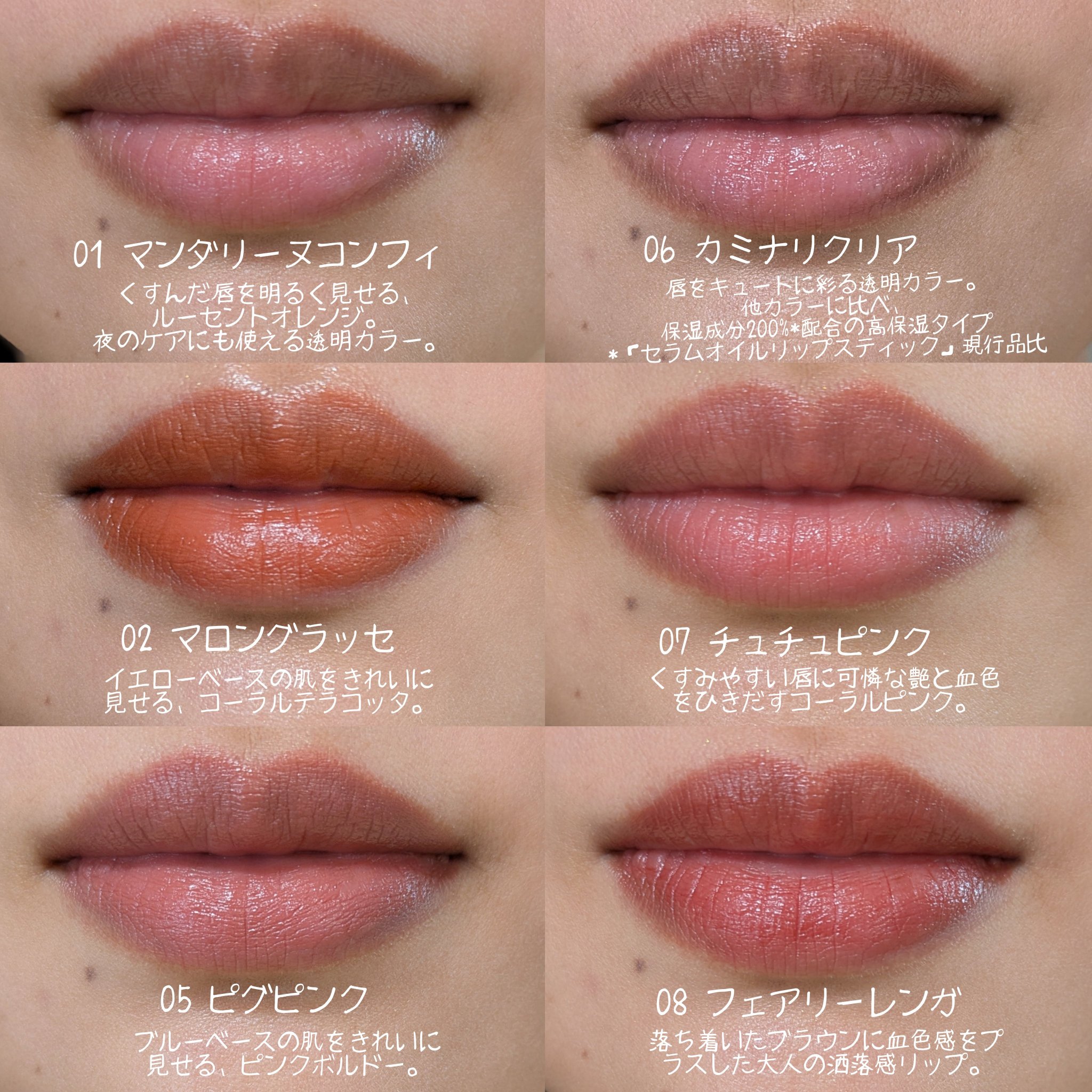 色み:どちらも肌に馴染んでかわいい💕 ナチュラルな色だから透明グロスと合わせると少し物足りなさもあるかも… 発色:芯が固めのため結構グリグリした🌀 なめらかさは感じられず💦 色持ち:ティント効果は正直0! ティッシュオフでかなり持っていかれる😭
