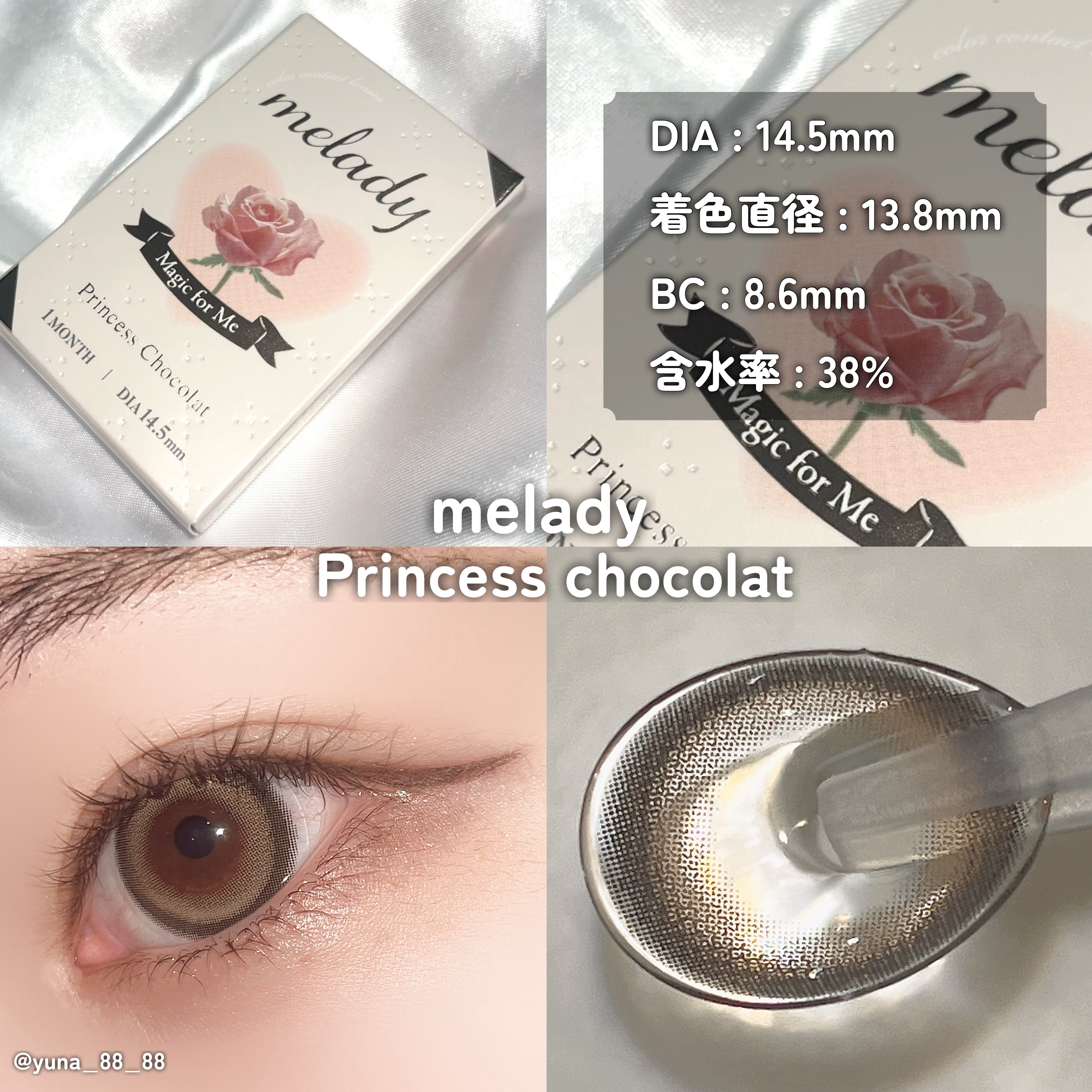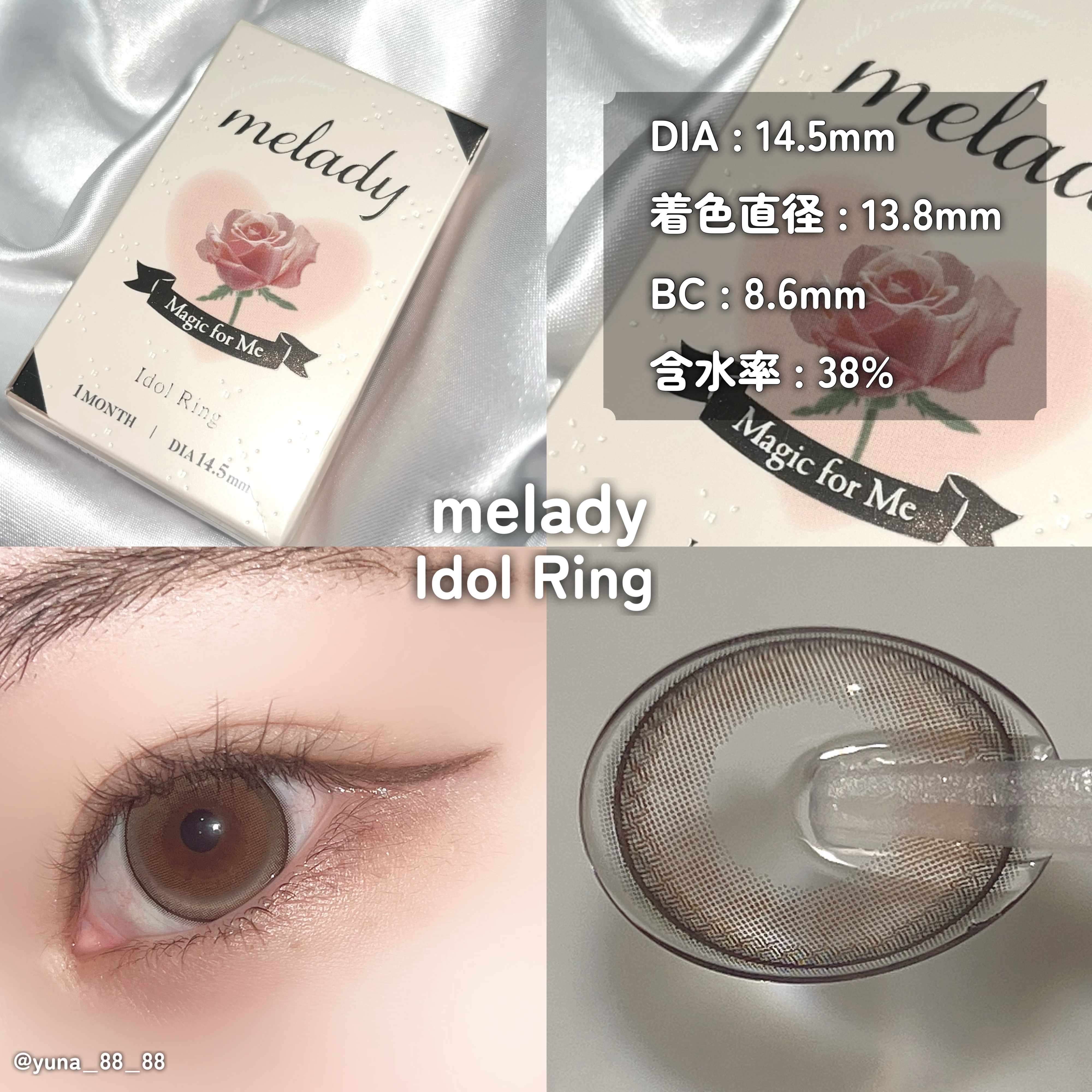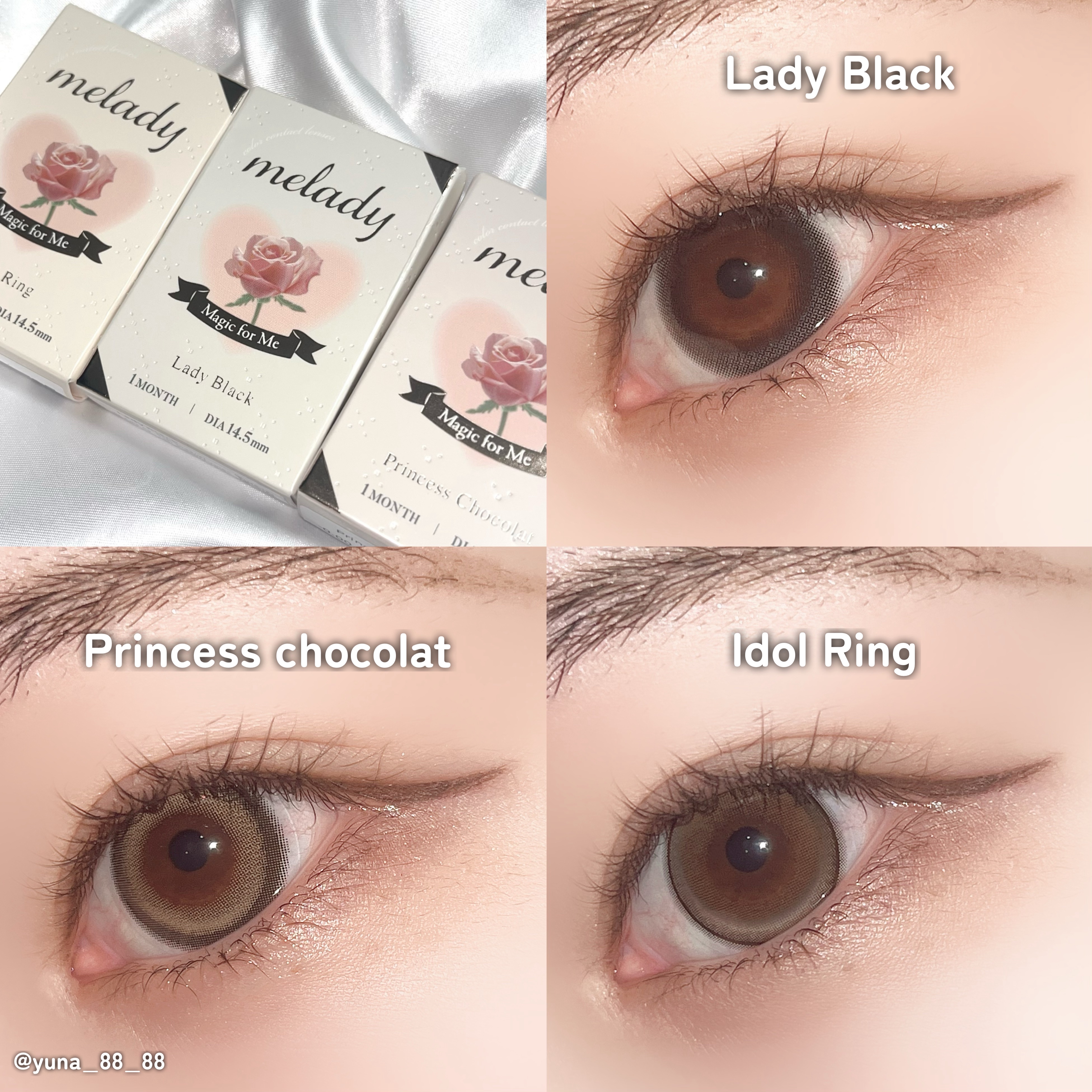 - 1か月ずぅーっとmeladyと一緒♡ 『melady(ミレディ)』より、かわいいが続くマンスリーがついに登場! ■みりにゃの人生カラコン! 甘くとろける瞳で、ず~っとお姫様気分♡ Princess Chocolat(プリンセスショコラ) DIA:14.5mm 着色直径:13.8mm しっかり太フチとあまくとろけるショコラブラウンでプリンセスみたいに愛される瞳に♡ ■みりにゃの勝負カラコン! 王道かわいさ!君だけの推しアイに♡ Idol Ring(アイドルリング) DIA:14.5mm 着色直径:13.8mm さりげない細フチとちゅるんブラウンが ナチュラルに瞳を強調♡ ■みりにゃのデイリーカラコン! 気取らないけどぬかりない。まさに“レディな私”♡ Lady Black(レディブラック) DIA:14.5mm 着色直径:13.8mm じゅわっとぼかした繊細なデザインで 透明感のある大きな瞳にみせる♡ カラーコンタクトレンズの不適正使用による眼障害の危険性等などがあります。 ●コンタクトレンズは高度管理医療機器です。不十分な洗浄・消毒など不適切なケアや、長時間・交換期間を超えた装用により、アレルギー性結膜炎、角膜感染症、角膜潰瘍等の重篤な眼障害が発生する危険性があります ●ご使用前に取扱説明書を確認してください 使用上の留意事項 ●眼科医院等を受診してからお求めください ●眼に異常を感じたら直ちにレンズ使用を中止し、お近くの眼科等で診察を受けてください ●医師の指示にしたがってご使用ください ●コンタクトレンズを装用する場合、自覚症状がなくても、眼科医院等での定期検査を受けてください ●レンズに不具合がある場合は使用しないでください