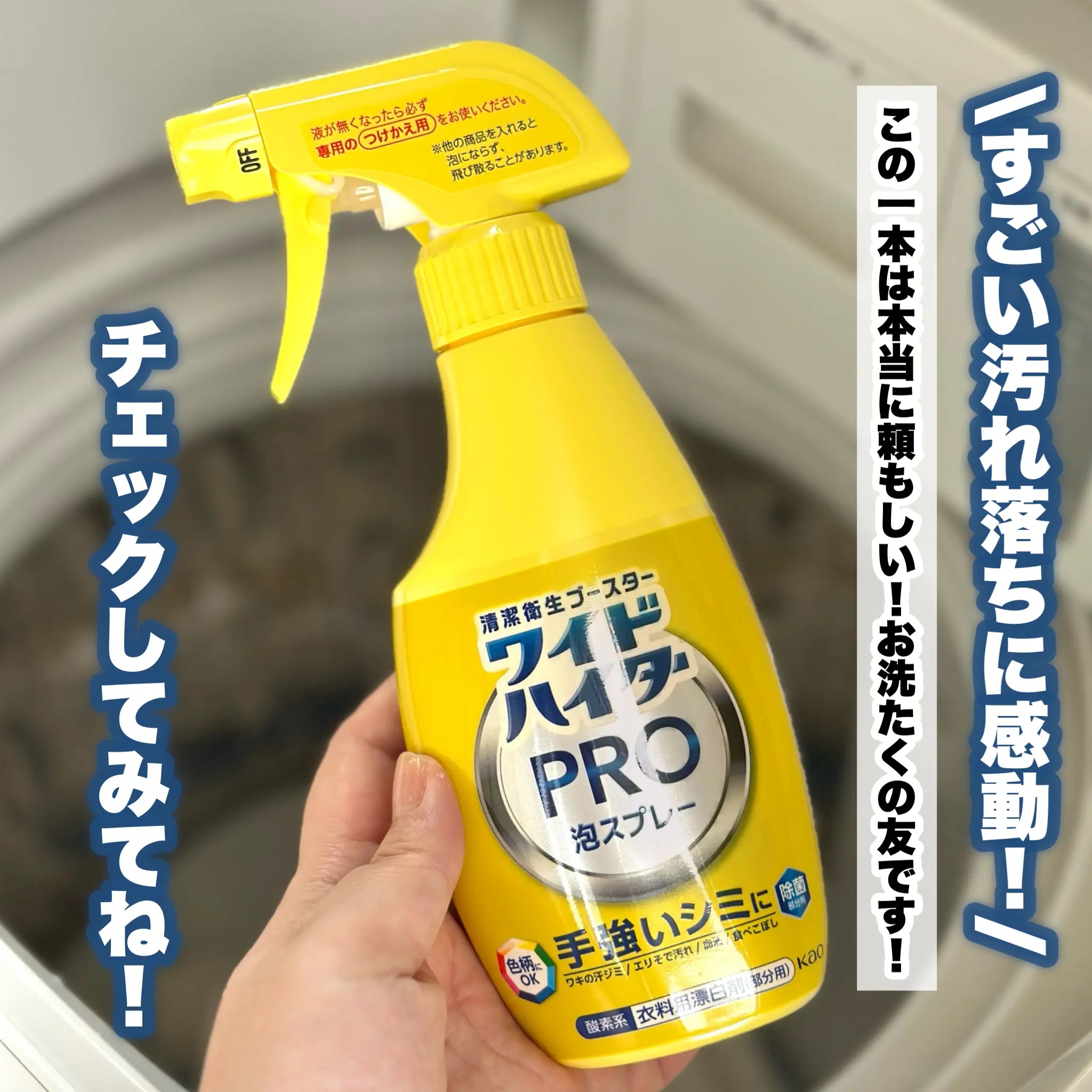 洗たく機に入れる前に気になる汚れシュッ!とケア✨″花王 ワイドハイターPROラク泡スプレー″ぬるま湯や中性洗剤クレンジングオイルで落ちない化粧汚れや古いシミ、ガンコなシミに!⬇️使用例✓ワキの汗ジミ✓エリそで汚れ✓血液(水洗い後)✓食べこぼし...