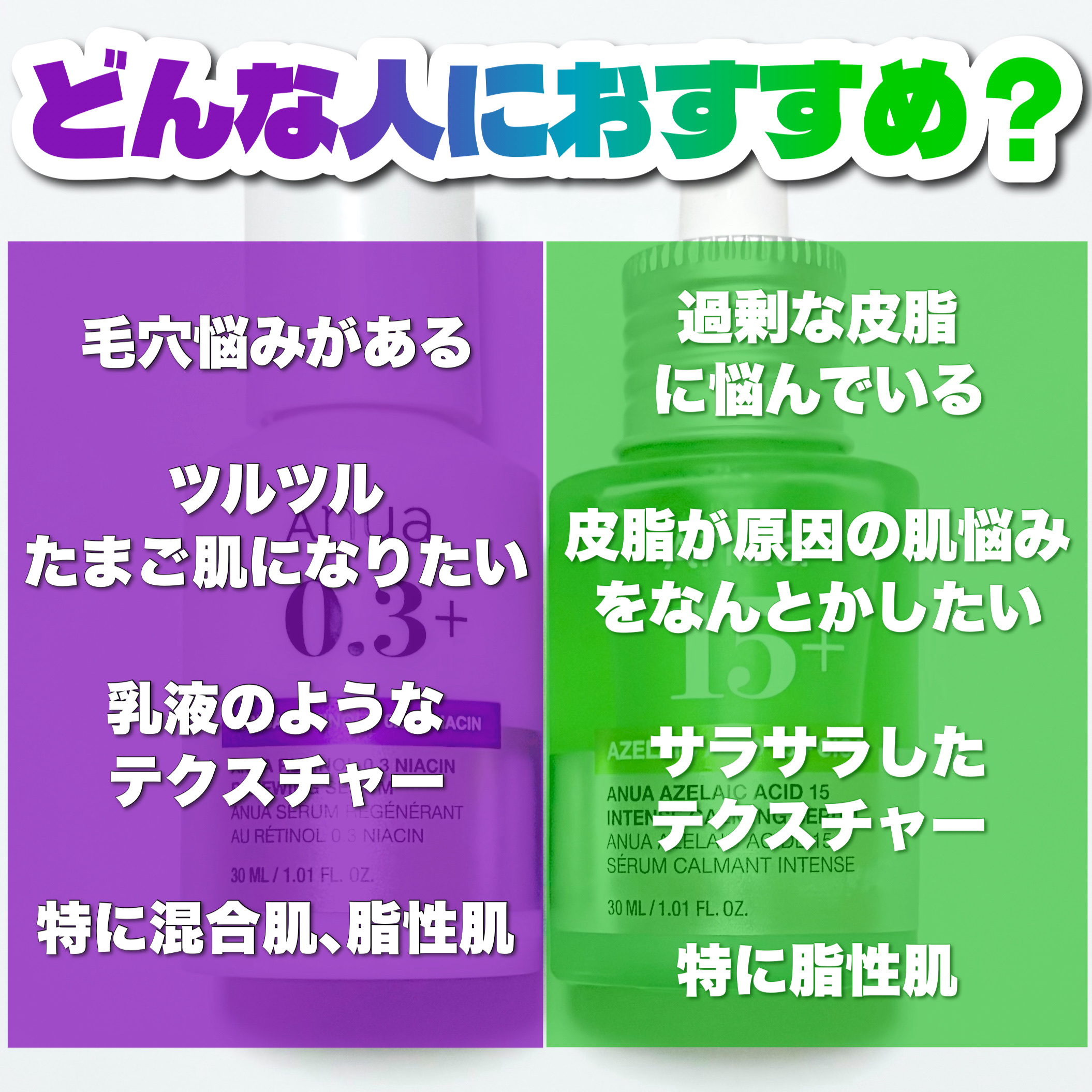 【徹底比較】アヌアの美容液どれがいいの?【Anua】レチノール0.3ナイアシンリニューイングセラム容量:30ml価格:3200円ダークスポットセラム容量:30ml価格:2800円アゼライン酸15インテンスカーミングセラム容量:30ml価格:2...