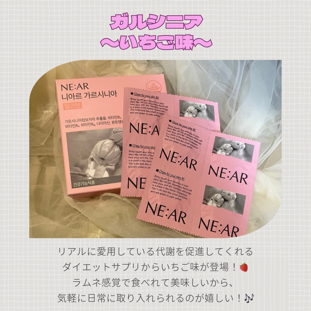 NE:AR(ニアル)ガルシニアプレミアムいちご味「より美しい明日の始まり」をモットーにした韓国のインナービューティーブランドNE:AR(ニアル)💖イメモはTWICEサナちゃん♡ニアルのガルシニアは、炭水化物が脂肪に変わるのを抑制する「HCAガ...