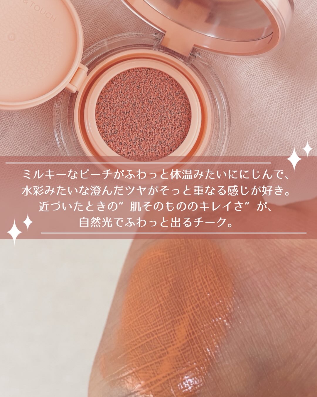 - トントン叩くだけで、ツヤっと血色感溢れる頬を演出。 豊富なカラーバリエーションで、自分にぴったりの色が見つかります。 さらに、目元(※)や唇にも使えるマルチユースタイプなので、これひとつで統一感のあるメイクが叶います。 POINT ベースメイクの上からでも重ねやすく、叩くほどにツヤと血色感が溢れる 水分エッセンス配合で、透明感 のあるしっとりした仕上がりを演出 多彩なカラーバリエーションで、アイ(※)やリップにも使えるマルチユースタイプ (※)ピーチネクターは目元にはご使用いただけません 2025年10月18日(土)(※1)より、全国のロフト・プラザ・shop in(※2)にて先行発売。 (※1)店頭発売日となり、購入可能日は各店舗により異なります (※2)一部店舗を除く