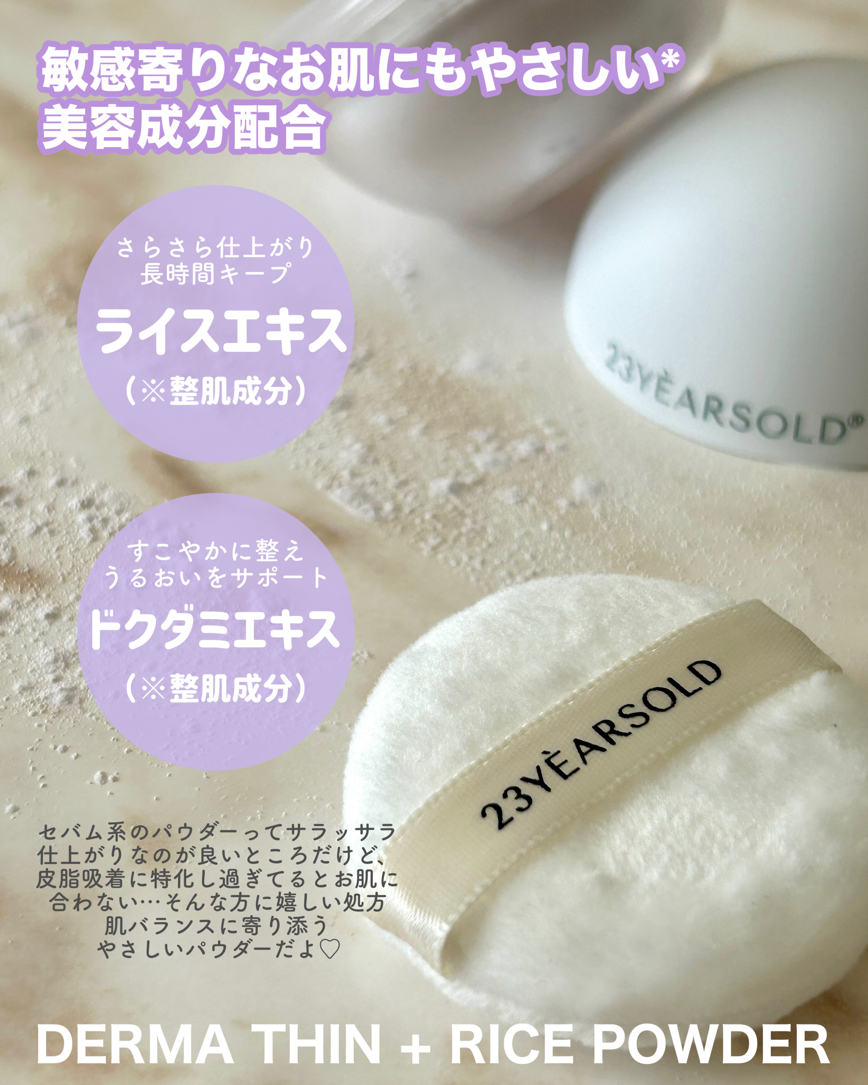 フィルターのような超微細パウダー✨23yearsold ダーマシンゼロセバムライスパウダー ラベンダー23yearsold様からいただきました💜✨特徴✨・1OUMの超微細パウダーが肌に軽くフィットし、毛穴を自然にカバー。まるで“つるんと卵肌”...