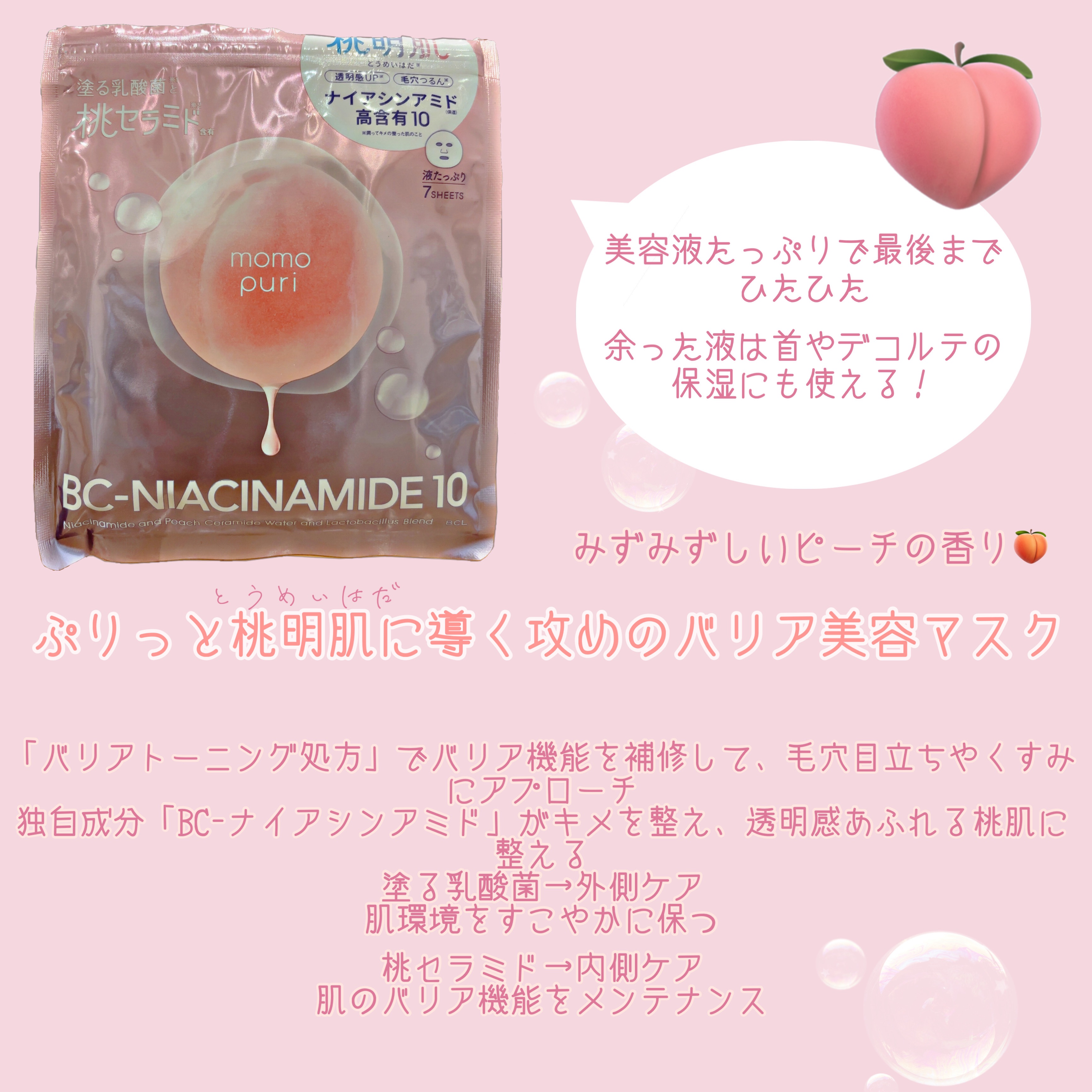 - ナイアシンアミド※高含有の美容液シートマスク キメを整え、潤いで輝く桃明肌(とうめいはだ)へ! 浸透※1効率に着目したナイアシンアミド高含有の美容液がひたひたたっぷり! シリーズ共通成分の乳酸菌※2と桃セラミド※3も含有し、毎日使い続けて調子の良いぷりぷり桃肌を目指して♡ ※保湿成分 ※1角層まで ※2乳酸桿菌 ※3フィトステリルグルコシド/グルコシルセラミド 2024年9月から先行発売