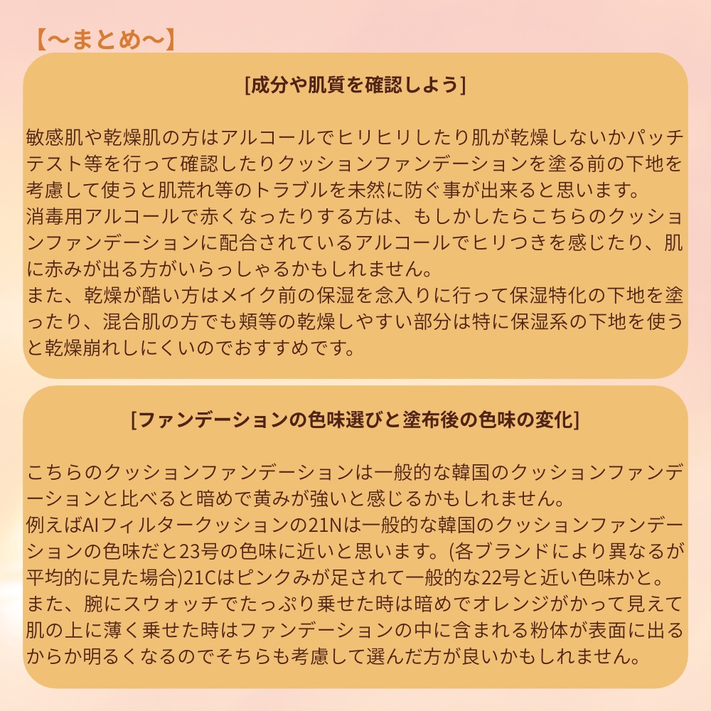 TIRTIRの新作ベースメイク•AIフィルタークッション&トーンアップエッセンスをモニターで頂いたのだけど、カバー力高め×重くないつけ心地って感じで確かにAI…! カバー力しっかり目なので、本当にちょっとの量を伸ばすのがコツ。厚く塗りすぎると崩れの元かも。 塗った直後の仕上がりは綺麗なのだけど、時間経過で粉っぽくなってくる&少しヒリヒリする感じがあったので、乾燥肌さんや敏感肌さんは合わせる下地を工夫する等、一手間が必要かも💭