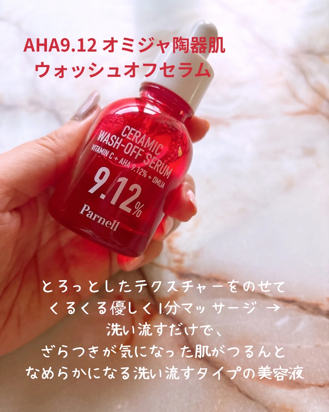 #提供#parnell#パーネル【parnell/#AHA9.12オミジャ陶器肌#ウォッシュオフセラム】塗る→一分待つ→洗い流す簡単に使えるピーリングセラム🫧セラムタイプだから塗ってる時に刺激や乾燥を感じにくくて良かったです◎洗い流すと手触り...