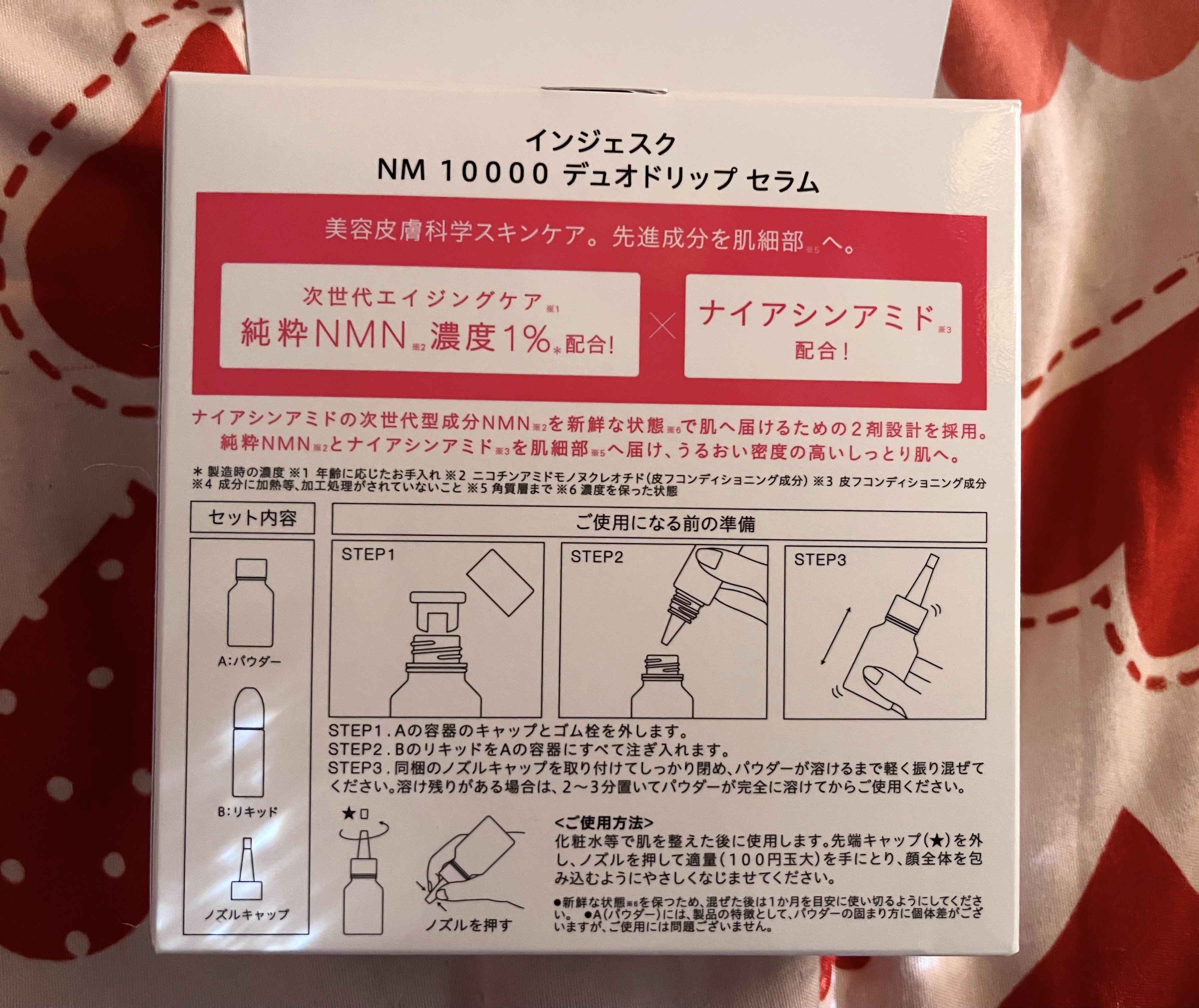 - 次äžä»£ãšã€ãžã³ã°ã±ã¢â»ïŒçŽç²NMNâ»ïŒ æ¿åºŠïŒïŒ â»ïŒïŒãã€ã¢ã·ã³ã¢ããâ»ïŒ ä»ããšã€ãžã³ã°ã±ã¢â»ïŒã§å€§æ³šç®ã®æåãNMNâ»ïŒã®ïŒïŒ é åâ»ïŒãå®çŸãNMNã«å€æãããçŸèãµã€ã¯ã«ããµããŒããããã€ã¢ã·ã³ã¢ããâ»5ãšåãããããšã§ãèãçŸãããªãããšããåããµããŒããããããã«æºã¡ããµã£ãããšããããªèãžãšå°ããŸãã NMNâ»ïŒããããã¬ãã·ã¥ãªç¶æ ã§äœ¿çšã§ãããããNMNâ»ïŒã¯ããªãŒãºãã©ã€æè¡ãçšããããŠããŒã«ãããã«ãªãããã«ã¯ããã€ã¢ã·ã³ã¢ããâ»ïŒãé åãïŒã€ãæ··ãåããããšã·ã¥ããšæº¶ããæ¿åºŠãä¿ã£ãç¶æ ã®ãŸãŸäœ¿ãåãããšãã§ããŸãã ïŒæ··ããåŸã¯ïŒãæãç®å®ã«ã䜿çšãã ããã â»ïŒ ãã³ãã³ã¢ããã¢ããã¯ã¬ãªããïŒç®ãã³ã³ãã£ã·ã§ãã³ã°æåïŒâ»ïŒ è£œé æã®æ¿åºŠïŒ2å€ãæ··ããéã®æçµæ¿åºŠïŒâ»ïŒ ç®ãã³ã³ãã£ã·ã§ãã³ã°æåãâ»ïŒ 幎霢ã«å¿ãããæå ¥ãã