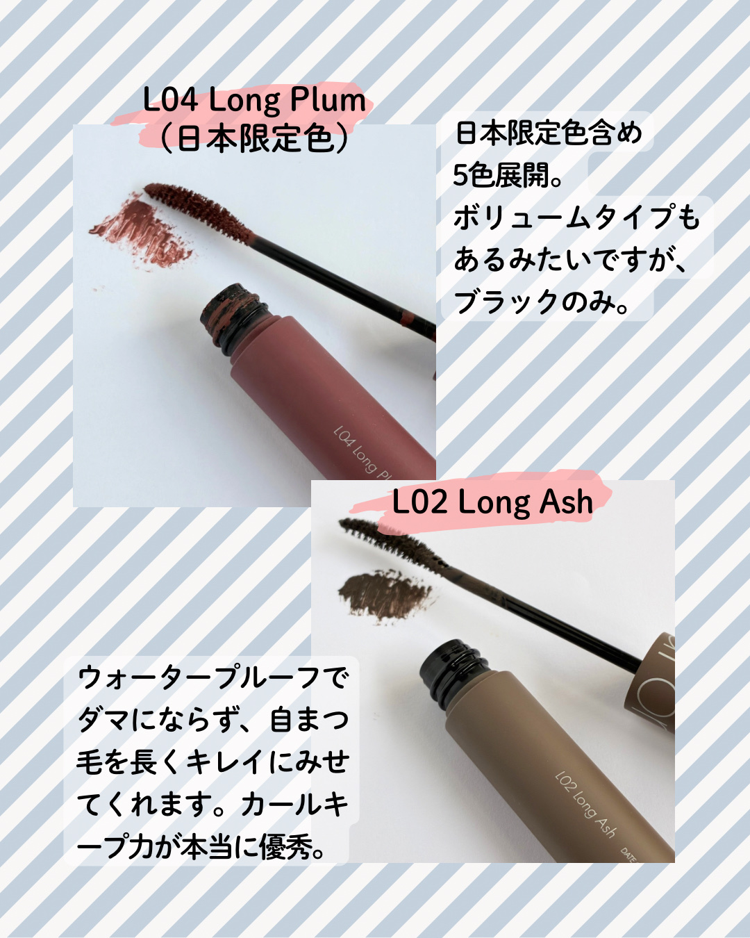 - ◆日本上陸前からすでに大人気 ロムアンドのマスカラがついに店舗販売スタート 1本1本のまつ毛をしっかりキャッチして 、 魅力的な目元を演出するムードマスカラ 。 セパレートされた綺麗な形と上向きカールを長時間キープします。 汗や皮脂に強く 、パンダ目を防ぐウォータープルーフタイプ 。 ◆おすすめポイント◆ ロングタイプは自まつ毛が 伸びたような自然で美しい仕上がりになります。 ボリュームタイプはブラックの1色展開で、まつ毛1本1本に存在感を出し、はっきりとした目元に仕上がります。 ・L01 LONG BLACK‥深みのあるブラックカラー ・L02 LONG ASH‥抜け感のあるアッシュブラウンカラー ・L03 LONG HAZEL‥初心者も使いやすいナチュラルブラウンカラー ・L04 LONG PLUM‥ほんのりとしたプラムブラウンカラー ・L05 LONG VINE‥ブドウのようなディープパープルカラー ・V01 VOLUME BLACK‥美しくボリューム感のあるまつ毛に仕上げるブラック