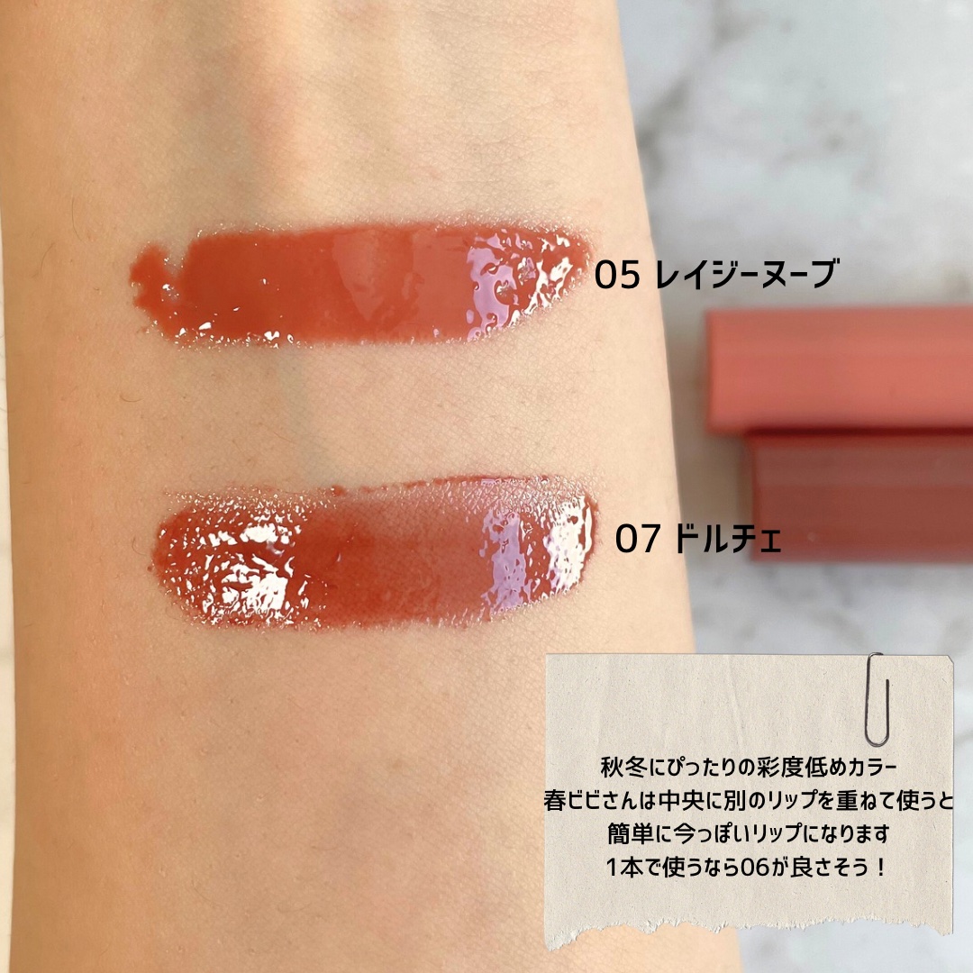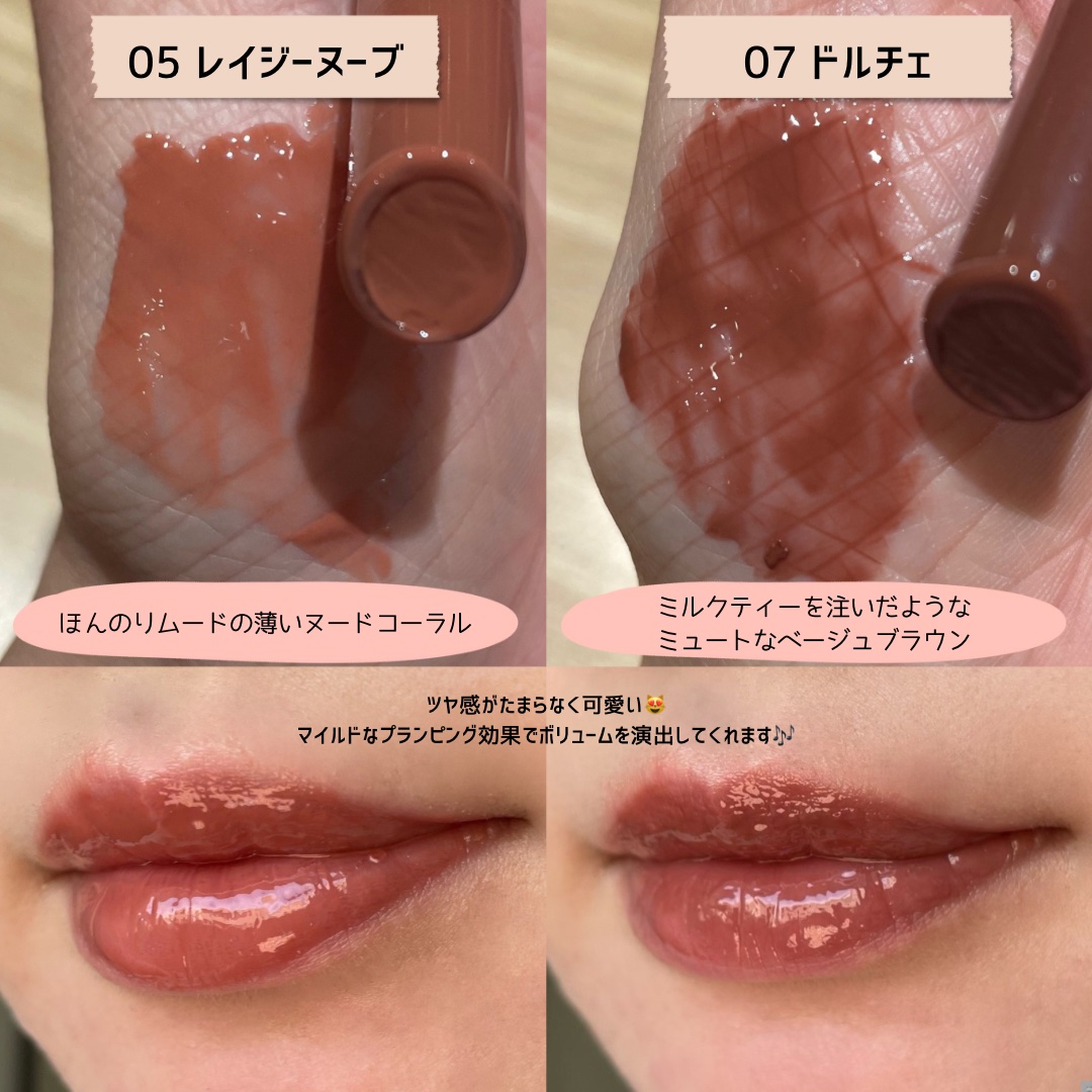 落ちにくいリップの定番にもなりつつあるこちら🫶🏻 このカラーがどんぴしゃ好みすぎる! 乾燥しにくいし色持ちもいいし、ぶるんとするし、カラー展開も幅広くて優秀すぎる。迷ったらこれを手に取ってしまうリップ。 厚みがあるけどねばっこさはないグロスだからうるちゅるのぷりぷり(?)唇になれて超かわいい😔💖