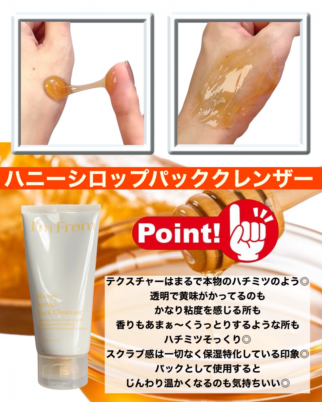 #PRI'mfromパッククレンザー3種好きな香りや肌悩みに合わせて選べるアイムフロムのパッククレンザー。ハニーシロップパッククレンザーは本物の蜂蜜のようなテクスチャーと香りで潤い、ツヤ、毛穴ケアに。なめらかでローリングするとほんのり温かくな...