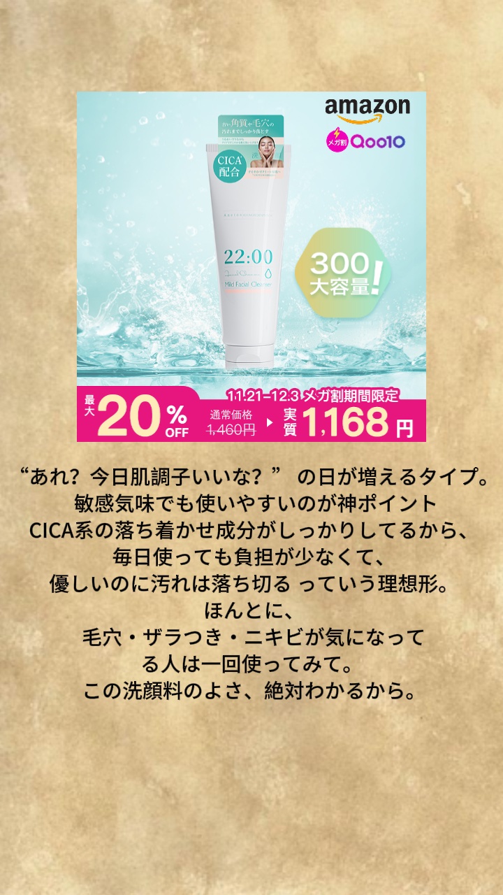 “22:00肌時計”というコンセプトが気になって購入。実際に使ってみると、メイク落とし後のダブル洗顔にもぴったりで、夜のスキンケアが前より楽しくなりました。翌朝の乾燥も気にならなくなった気がします。...