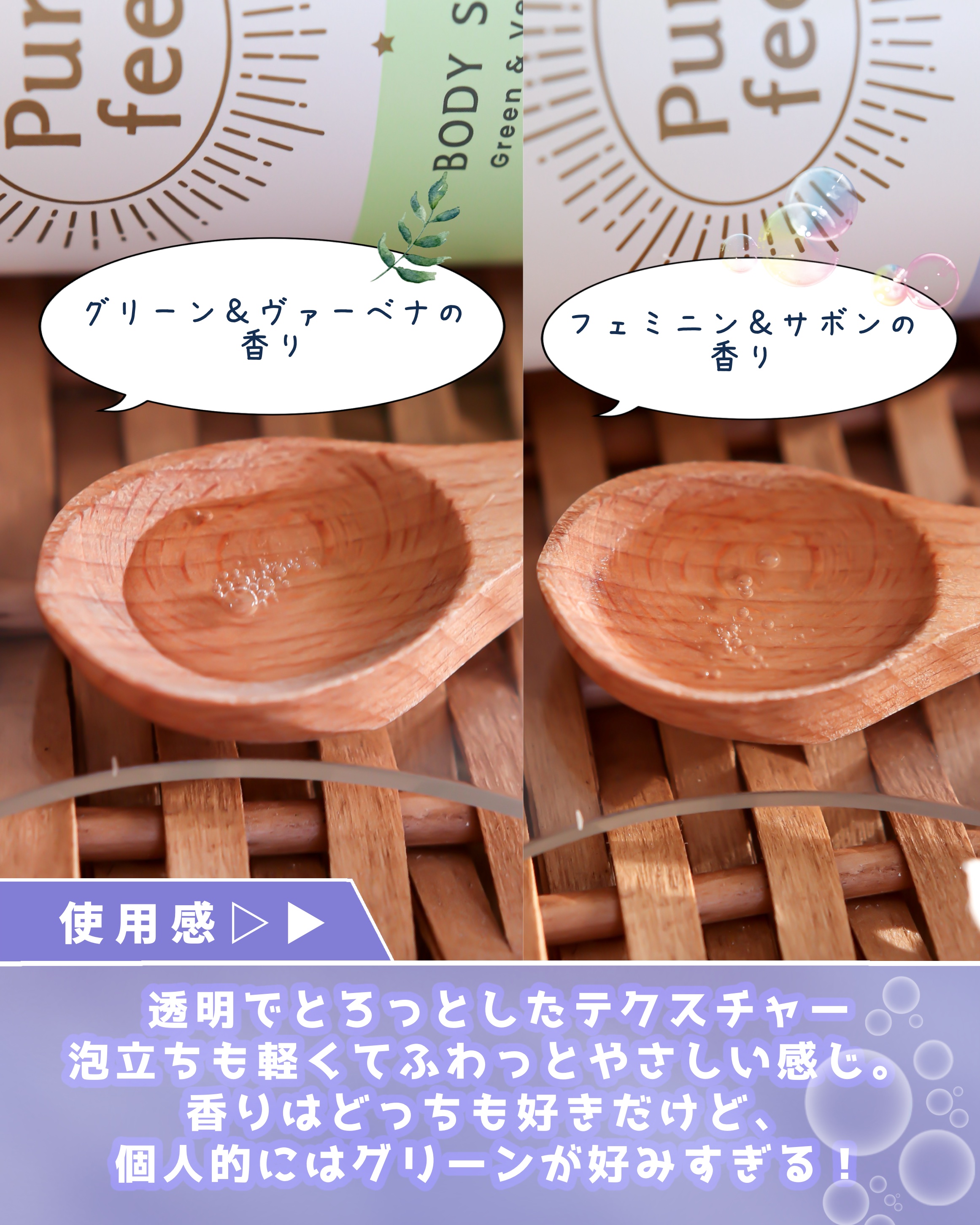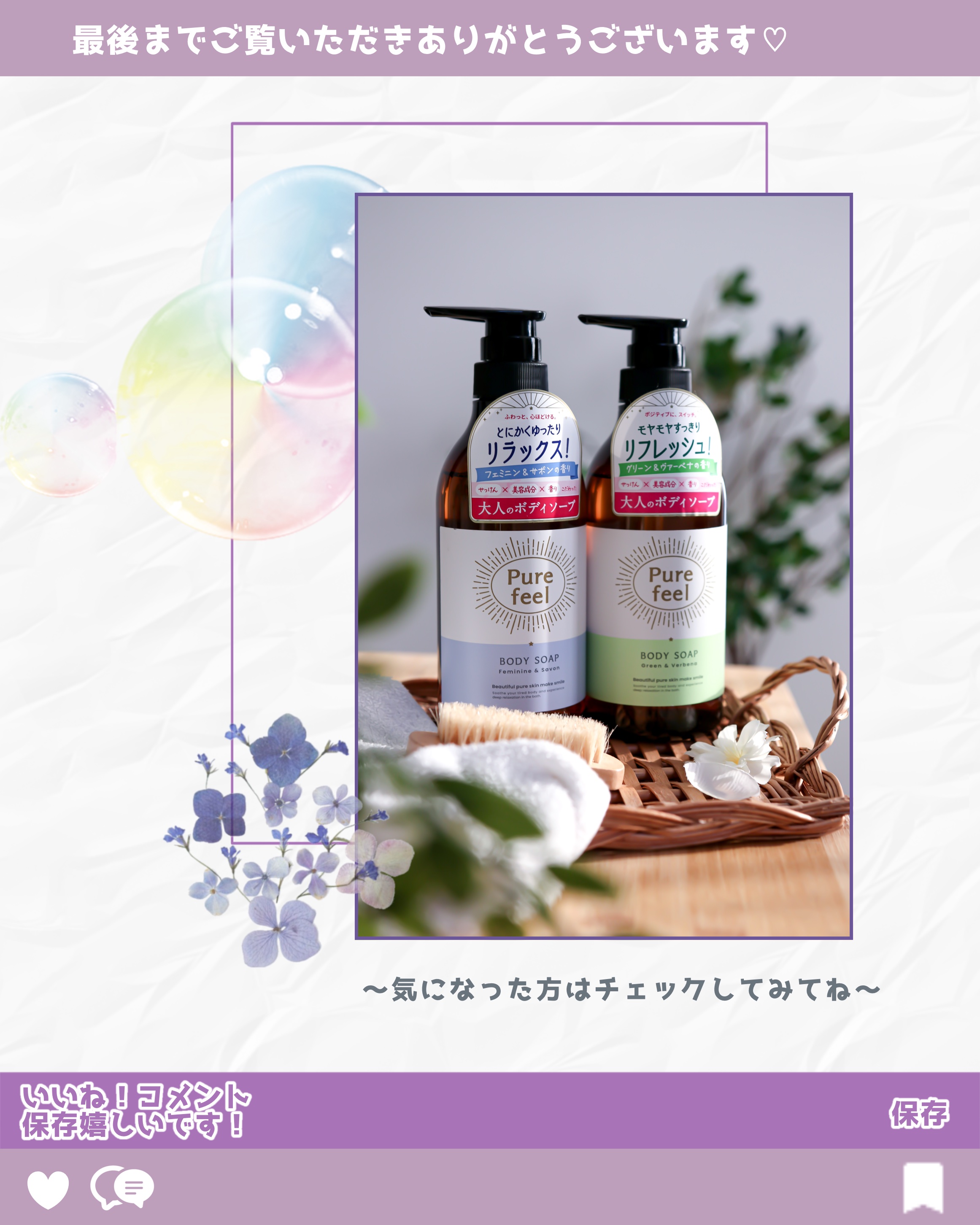 Purefeelボディソープグリーン&ヴァーベナの香り/フェミニン&サボンの香り@daiichi_sekken_official様より提供いただきました✨せっけん×美容成分で大人向けボディケア🩷☑︎天然由来せっけんの成分をそのまま使用し、うる...