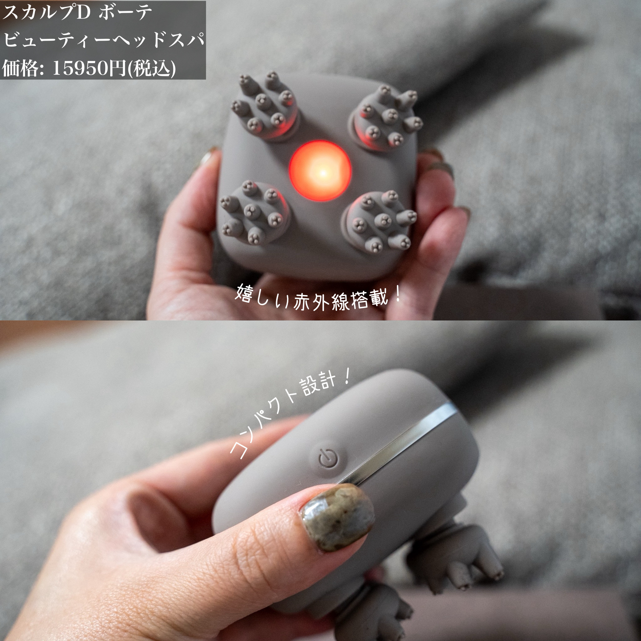 - 頭皮をグっと引き上げるブラシで極上スパ体験 4つのヘッド、合計28か所の接触点が微細な動きを放ち、確かなパワーで立体的な刺激をもたらします。また、3D頭部フィット設計により、ブラシが頭の丸みに沿って自然に頭頂部まで動くため、特別な技術は不要。頭皮にあてて軽く動かすだけで、ヘッドスパのような贅沢な体験をお楽しみいただけます。 人間工学に基づいたブラシでスッキリ洗浄 自社調査によると、女性の2人に1人が「髪だけでなく、頭皮までちゃんと洗えているか不安」に感じていますと回答※。頭皮の皮脂汚れや毛穴のつまりは、べたつきやにおいだけでなく、薄毛や抜け毛のリスクにも繋がります。「スカルプD ボーテ ビューティーヘッドスパ」は、独自技術として特許取得されている人間工学に基づいたオリジナルのブラシ設計です。シャンプー中にご使用いただくと、頭皮のスッキリ感と髪のふんわり感を体感いただけます。 ※2025年2月実施、全国20~50代女性300名への「頭皮トラブル」に関するインターネット調査より 赤外線搭載で、じんわり温熱ケア 赤外線搭載で、深部※をじんわり温めながら頭皮をほぐします。温熱ケアが、毛髪を作り出す細胞の活性化にもアプローチ。将来の美髪ケアにも繋がります。肩や首にご使用いただく際にも、温熱による血流促進で、凝りほぐしに効果が期待できます。 ※角質層まで 心地よさとフィット感を自由にカスタマイズ 「スカルプD ボーテ ビューティーヘッドスパ」のブラシ部分には、ハードタイプとソフトタイプの2種のアタッチメントが付属されています。また、強さレベルは3段階から選択可能。お好みのブラシタイプとモードで、あなたの頭皮に合ったマッサージが可能です。 <アタッチメント> ・ソフトタイプ(やさしい刺激、敏感肌・初心者向け) ・ハードタイプ(しっかりした刺激、深層マッサージ向け) <強さレベル> ① ソフトケアモード ② ナチュラルケアモード ③ ディープケアモード 防水仕様&軽量!手のひらサイズで疲れにくく、続けやすい 「スカルプD ボーテ ビューティーヘッドスパ」は、入浴中や入浴後のタイミングでご使用いただくことをおすすめしています。そのため、IPX7防水仕様で浴室でも気軽に使用可能。また、手のひらサイズで172gとスマホより軽く※、使いやすさにもこだわりました。 ※iPhone Pro Maxシリーズと比較