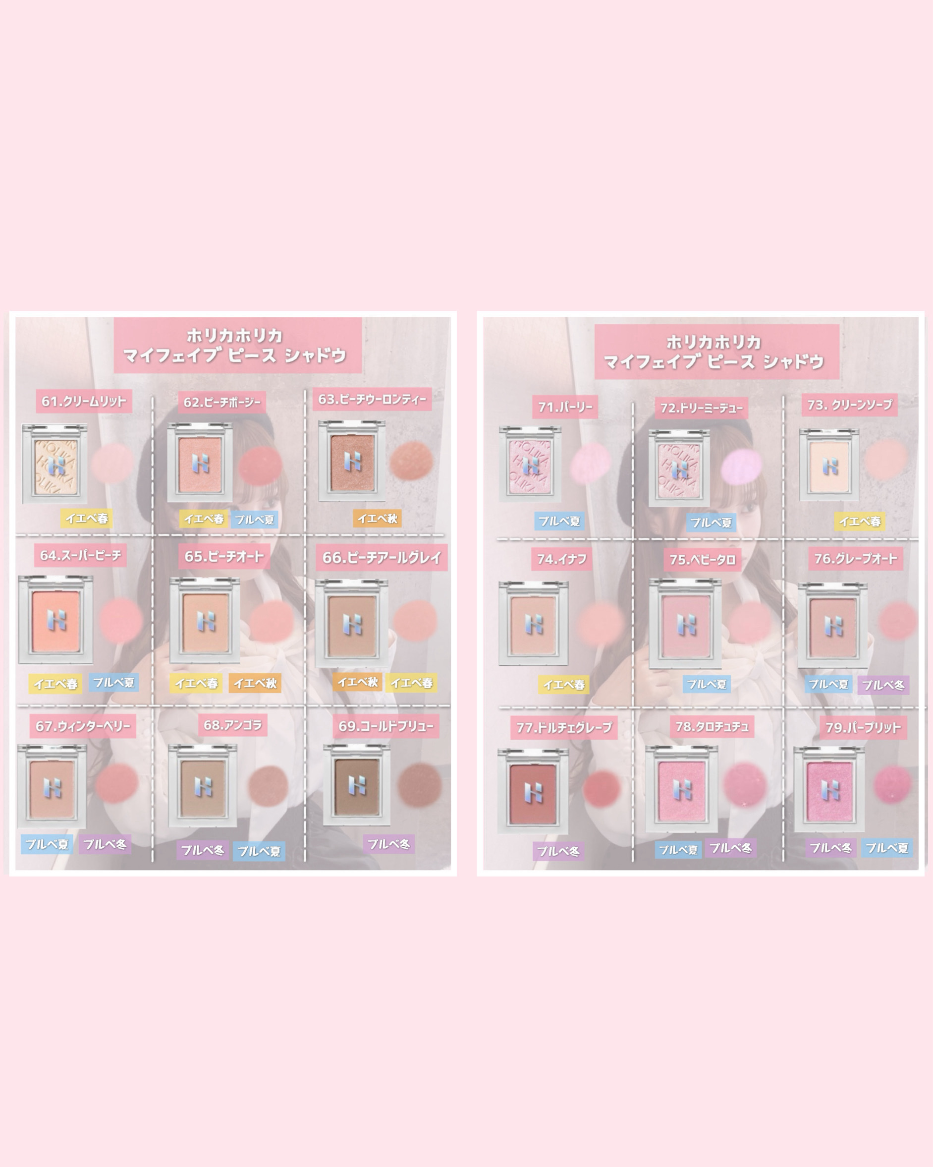 WINTER PEACHシリーズは桃やあんずをイメージしたふんわり柔らかなピンクカラーがメイン🍑♡ 何度重ねても柔らかい印象になるので初心者さんにもおすすめ🔰◎ 単色シャドウを選ぶときはベースカラー ミディアムカラー シェードカラー ラメやグリッターを1つずつ選ぶと良いよ〜🙆🏻♀️