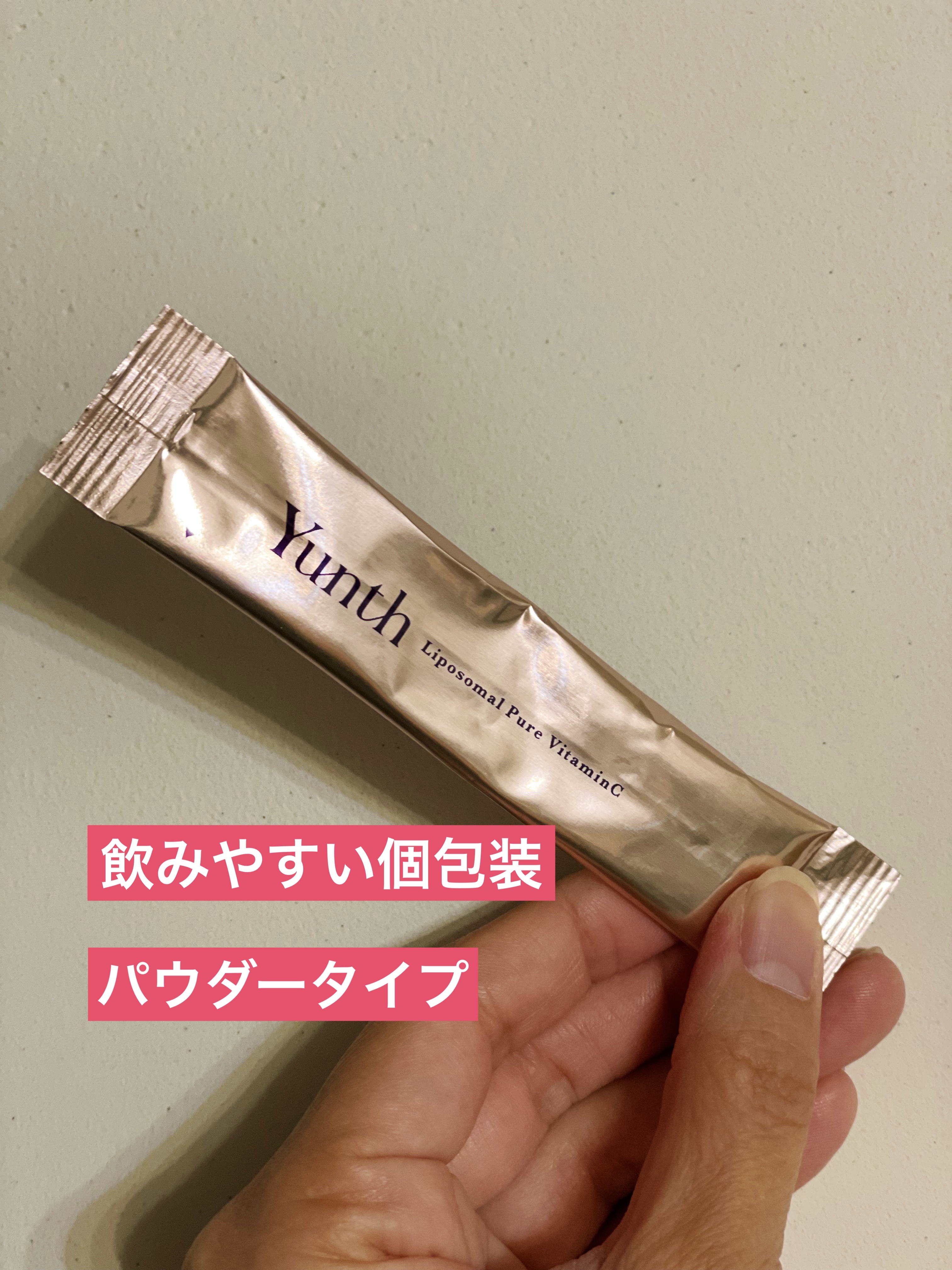 - ①レモン約100個分相当の高濃度ビタミンC、1本に2,000mg配合 ビタミンCは、体内でつくることができないため、毎日の補給が欠かせない栄養素です。インナーケアだけでなく、エイジングケア*1、そして日差しが気になる季節にも欠かせません。「Yunth リポソーム生ビタミンC」は、1本あたり2,000mg*2(レモン約100個分相当*2)の高濃度ビタミンCを贅沢に配合し、毎日の美しさと健やかさを力強くサポートします。 *1 年齢に応じたケア *2 リポソームビタミンC1,000mgとして ②高吸収型「リポソーム生ビタミンC」×即攻型「生ビタミンC」を配合 ビタミンCは大量に摂取しても体外に排出されやすいという特性があります。 Yunthではゆっくり届く[高吸収型]リポソーム生ビタミンCと、素早く広がる[即攻*型]の生ビタミンCを1000㎎ずつ配合し、常に必要な量を体内に巡らせられる設計に。 * 溶ける速さのこと ③レチノール&ホワイトトマトで美容の贅沢ケア 生ビタミンCに加え、レチノール(ビタミンA)や、無色カロテノイドが豊富に含まれているホワイトトマトエキスを厳選配合。 ビタミンCと一緒に摂りたいレチノールと同時に摂取することで相性がよいと言われており、ホワイトトマトは、日差しの強い季節に取り入れたい成分として注目されています。 内側から美容ケアをサポートし、エイジングケア*にもアプローチします。 * 年齢に応じたケア ④人工甘味料など無添加でも、飲みやすく・続けやすい 毎日口にするものだから、余計なものは入れていません。 人工甘味料、合成香料、合成着色料は一切不使用。 レモンのビタミンCをそのままに、クセになるすっぱさです。 さっと溶けて飲みやすく毎日続けられるよう、超微細なパウダータイプです。 ※公式サイト、ECモール(Amazon、楽天など)で発売中
