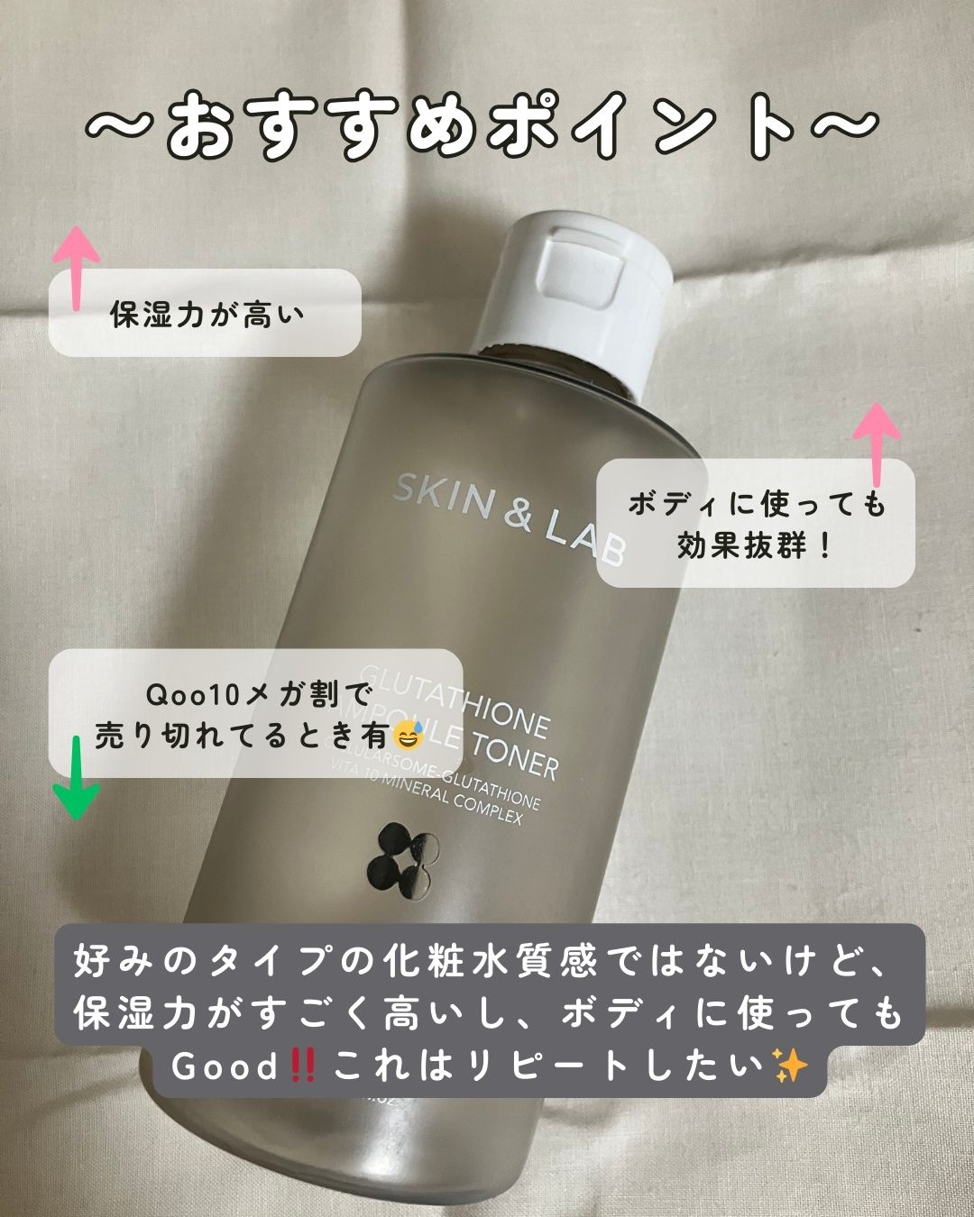 。.ꕤ‿SKIN&LABグルタチオンアンプルトナー‿ꕤ.。純度99%のグルタチオン×10種のビタミン・ミネラルが肌のくすみにアプローチ!少しとろみのあるテクスチャーで、肌なじみは悪くないです。2週間使い続けたところですが、少し肌がトーンアップ...