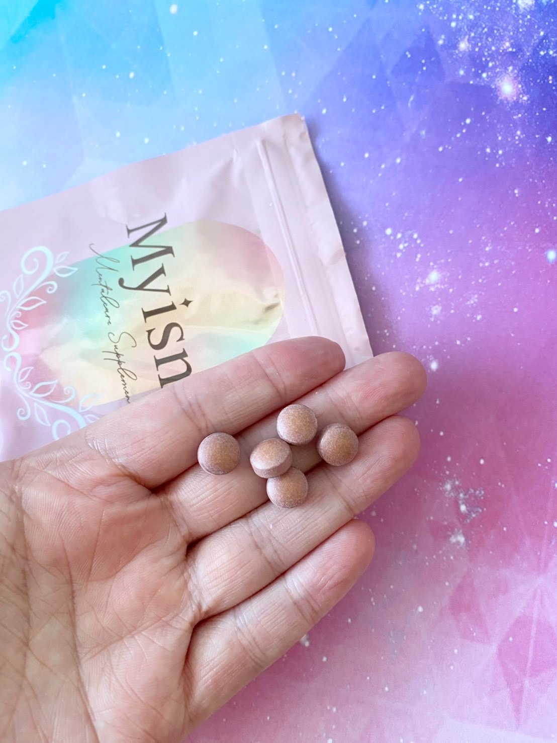 Myismメンタルケアサプリメント"月イチ、メンブレもうやめない?女性のためのメンタルケアサプリ"ピンクパッケージがかわいい。チョコレートの香りのサプリメント。1日2粒、小粒で噛まずに水またはぬるま湯で摂取。生理前ってイライラしたり、仕事も集...