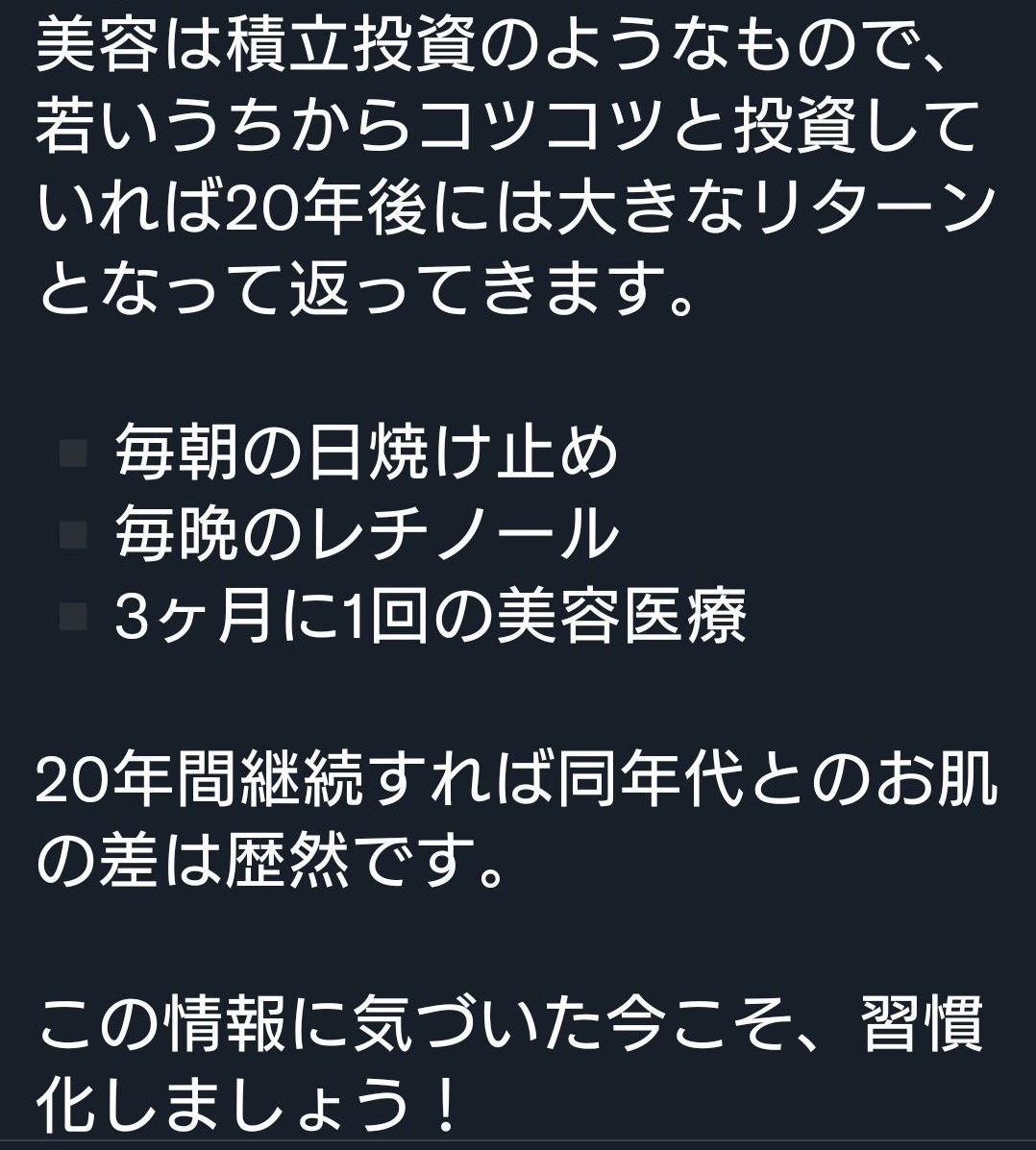 【黒ずみ毛穴】美容は積立投資のようなもので、若いうちからコツコツと投資していれば20年後には大きなリターンとなって返ってくる。習慣化が大事!✨毎朝の日焼け止め✨毎晩のレチノール✨3ヶ月に1回の美容医療...