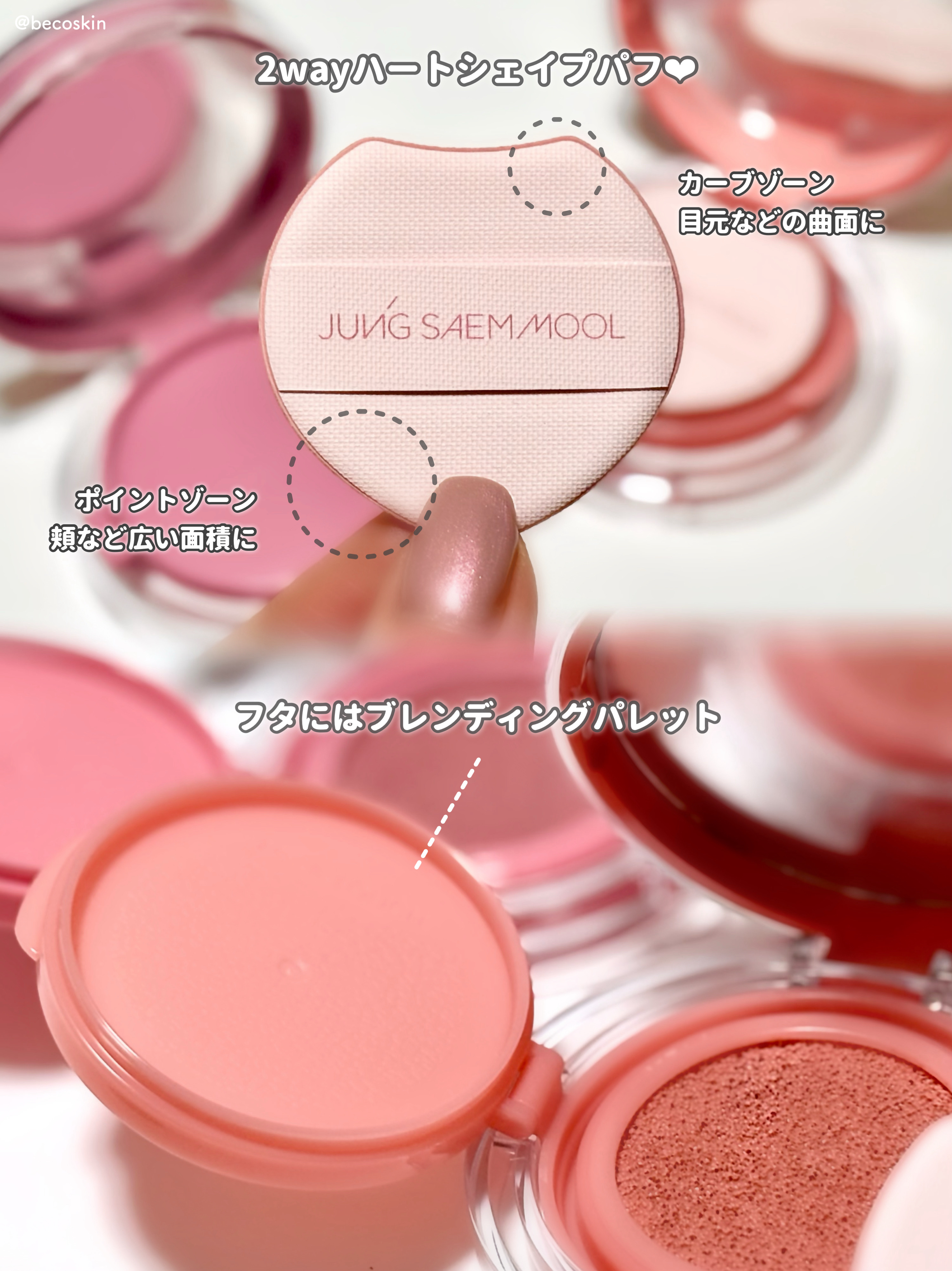 “クッションの名家”ジョンセンムルから新しくクッションタイプのチークが登場💖JUNGSAEMMOOLアーティストクッションブラッシュトントン叩くだけでツヤっと血色感溢れる頬を演出するクッションタイプのチーク!水分エッセンスが77%配合で乾燥せ...