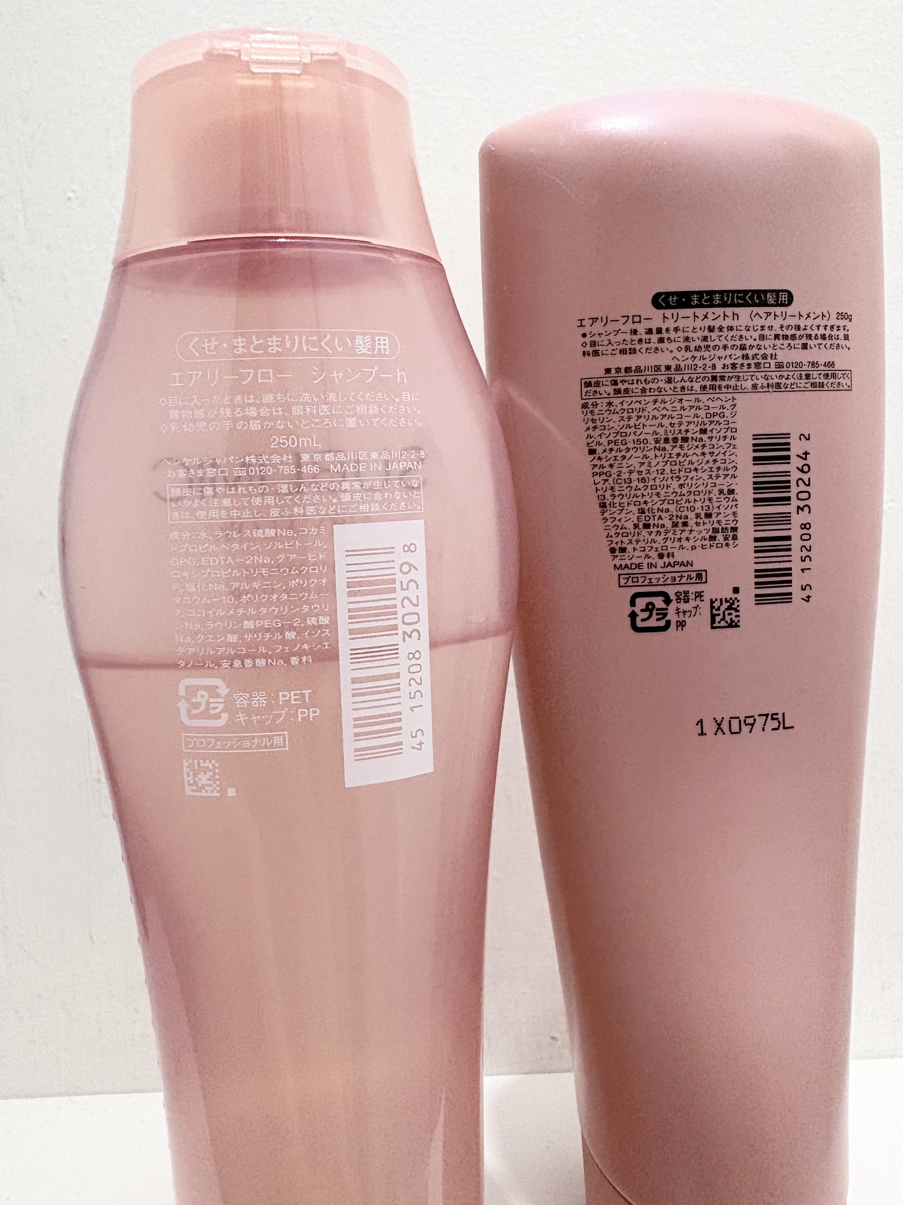 - <シャンプー 250mL> 水、ラウレス硫酸Na、コカミドプロピルベタイン、ソルビトール、DPG、EDTA-2Na、グアーヒドロキシプロピルトリモニウムクロリド、塩化Na、アルギニン、ポリクオタニウム-10、ポリクオタニウム-7、ココイルメチルタウリンタウリンNa、ラウリン酸PEG-2、硫酸Na、クエン酸、サリチル酸、イソステアリルアルコール、フェノキシエタノール、安息香酸Na、香料 <トリートメント(U) 250mL> 水、イソペンチルジオール、ベヘントリモニウムクロリド、ベヘニルアルコール、グリセリン、ステアリルアルコール、DPG、ジメチコン、ソルビトール、グリオキシル酸、PEG-150、マカデミアナッツ脂肪酸フィトステリル、ヒドロキシエチルウレア、ミリスチン酸イソプロピル、ラウリルトリモニウムクロリド、アルギニン、アミノプロピルジメチコン、水添ポリイソブテン、ステアルトリモニウムクロリド、ポリシリコーン-13、塩化ヒドロキシプロピルトリモニウムデンプン、乳酸、塩化Na、尿素、乳酸Na、セテアリルアルコール、イソプロパノール、サリチル酸、メチルタウリンNa、アモジメチコン、トリエチルヘキサノイン、PPG-2-デセス-12、EDTA-2Na、乳酸アンモニウム、セトリモニウムクロリド、トコフェロール、安息香酸Na、フェノキシエタノール、香料 <トリートメント(T) 250mL> 水、イソペンチルジオール、ベヘントリモニウムクロリド、グリセリン、ステアリルアルコール、ジメチコン、ソルビトール、ベヘニルアルコール、セタノール、グリオキシル酸、PEG-150、マカデミアナッツ脂肪酸フィトステリル、ミリスチン酸イソプロピル、ヒドロキシエチルウレア、ラウリルトリモニウムクロリド、水添ポリイソブテン、ポリシリコーン-13、アミノプロピルジメチコン、ステアルトリモニウムクロリド、乳酸、塩化Na、イソプロパノール、DPG、トリエチルヘキサノイン、ラウリン酸PEG-2、アモジメチコン、メチルタウリンNa、サリチル酸、PPG‐2‐デセス‐12、EDTA‐2Na、乳酸アンモニウム、セトリモニウムクロリド、トコフェロール、安息香酸Na、フェノキシエタノール、香料