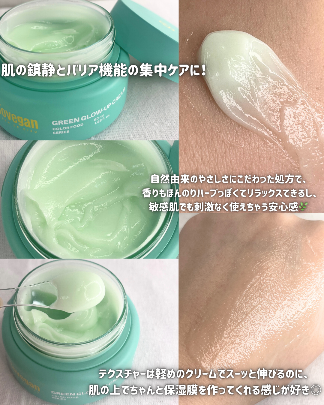 肌の鎮静とバリア機能のサポートに集中したビーガンクリーム🥑弱酸性フォーミュラで肌バランスを整え、健やかな肌環境をキープ!ツボクサ葉・ヨモギ葉・ノニなどのグリーンフード成分が配合されてるよ🌿肌がゆらぎやすい時とかにおすすめ!クリームだけど、テク...
