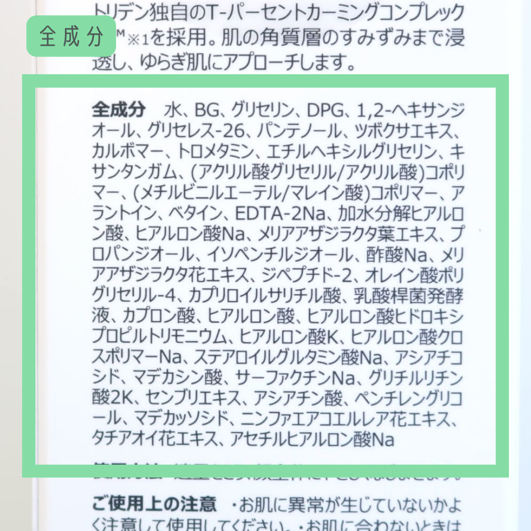 - <50ml> 水、BG、グリセリン、DPG、1,2-ヘキサンジオール、グリセレスー26、パンテノール、ツボクサエキス、カルボマー、トロメタミン、エチルヘキシルグリセリン、キサンタンガム、(アクリル酸グリセリル/アクリ ル酸)コポリマー、(メチルビニルエーテル/マレイン酸)コポリマー、アラントイン、ベタイン、EDTA-2Na、加水分解ヒアルロン酸、ヒアルロン酸Na、メリアアザジラクタ葉エキス、プロパンジオール、イソペンチルジオール、酢酸Na、メリアアザジラクタ花エキス、ジペプチドー2、オレイン酸ポリグリセリルー 4、カプリロイルサリチル酸、乳酸菌発酵液、カプロン酸、ヒアルロン酸、ヒアルロン酸ヒドロキシプロピルトリモニウム、ヒアルロン酸K、ヒアルロン酸クロスポリマーNa、ステアロイルグルタミン酸Na、アシアチコシド、マデカシン酸、サーファクチンNa、グリチルリチン酸2K、センブリエキス、アシアチン酸、ペンチレングリコール、マデカッソシド、ニンファエアコエルレア花エキス、タチアオイ花エキス、アセチルヒアルロン酸Na
