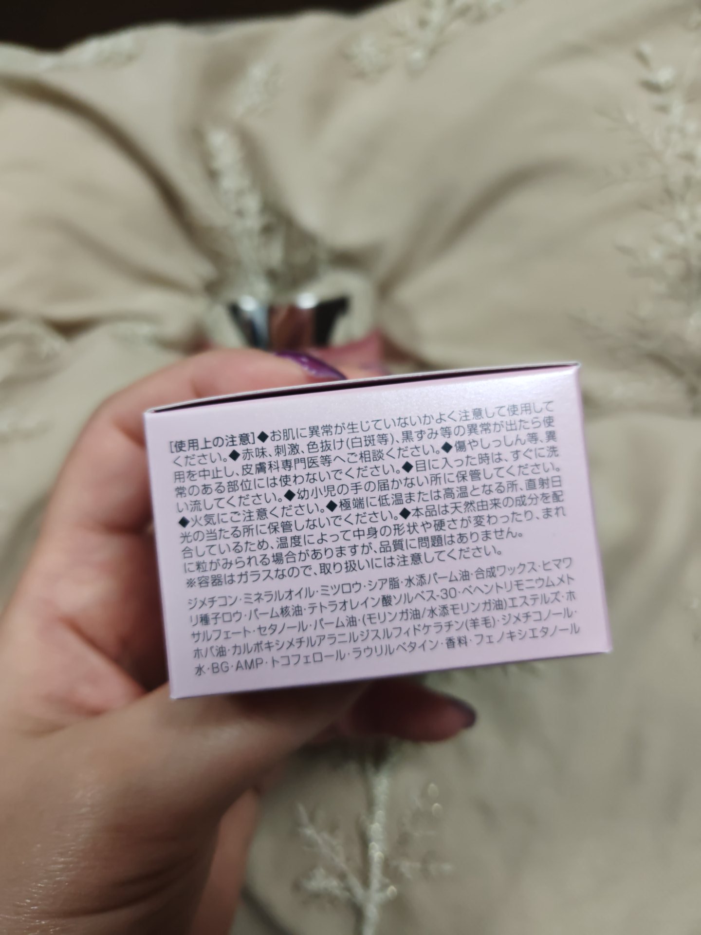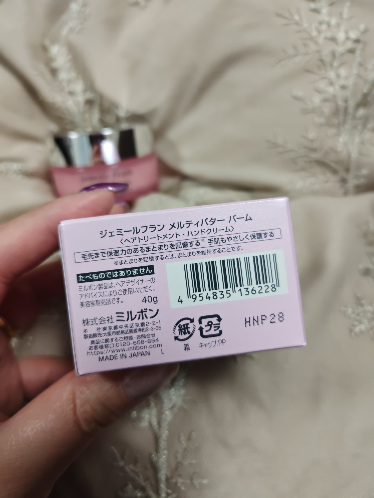 - <40g> ジメチコン、ミネラルオイル、(モリンガ油/水添モリンガ油)エステルズ、ミツロウ、シア脂、ポリエチレン、ヒマワリ種子ロウ、テトラオレイン酸ソルベス-30、ベヘントリモニウムメトサルフェート、セタノール、ホホバ油、カルボキシメチルアラニルジスルフィドケラチン(羊毛)、ジメチコノール、水、BG、AMP、トコフェロール、ラウリルベタイン、香料、フェノキシエタノール