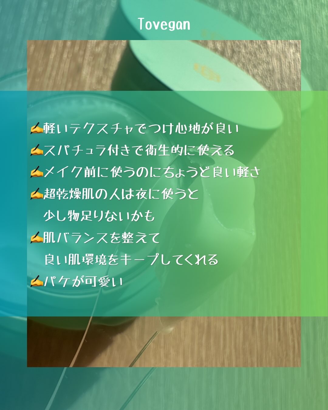 肌の鎮静とバリア機能のサポートに集中したビーガンクリーム🥑弱酸性フォーミュラで肌バランスを整え、健やかな肌環境をキープ!ツボクサ葉・ヨモギ葉・ノニなどのグリーンフード成分が配合されてるよ🌿肌がゆらぎやすい時とかにおすすめ!クリームだけど、テク...