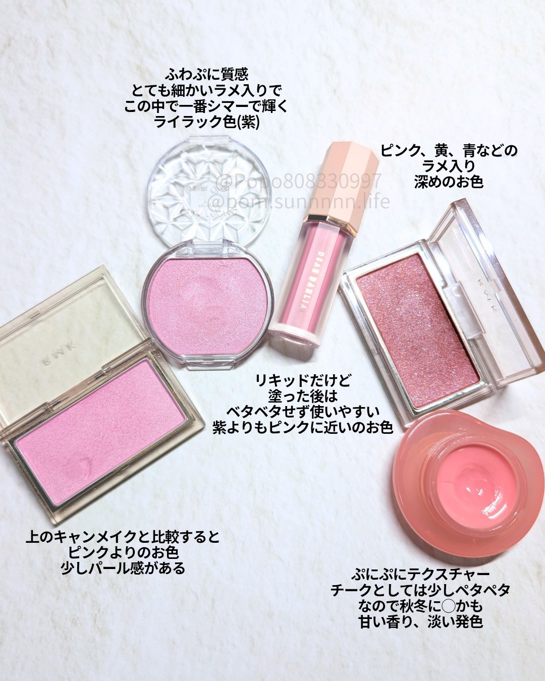 パープル&ピンク系チーク記録📝ピンク系のミルクモーヴはあえて一緒に撮ってみました。①セザンヌチークブラッシュ03ミルクモーヴふわっとした粉質。マットだけどやや透け感もある仕上がり。白み青みのピンクではあるけれど、私の肌だとニュートラル系に発色...
