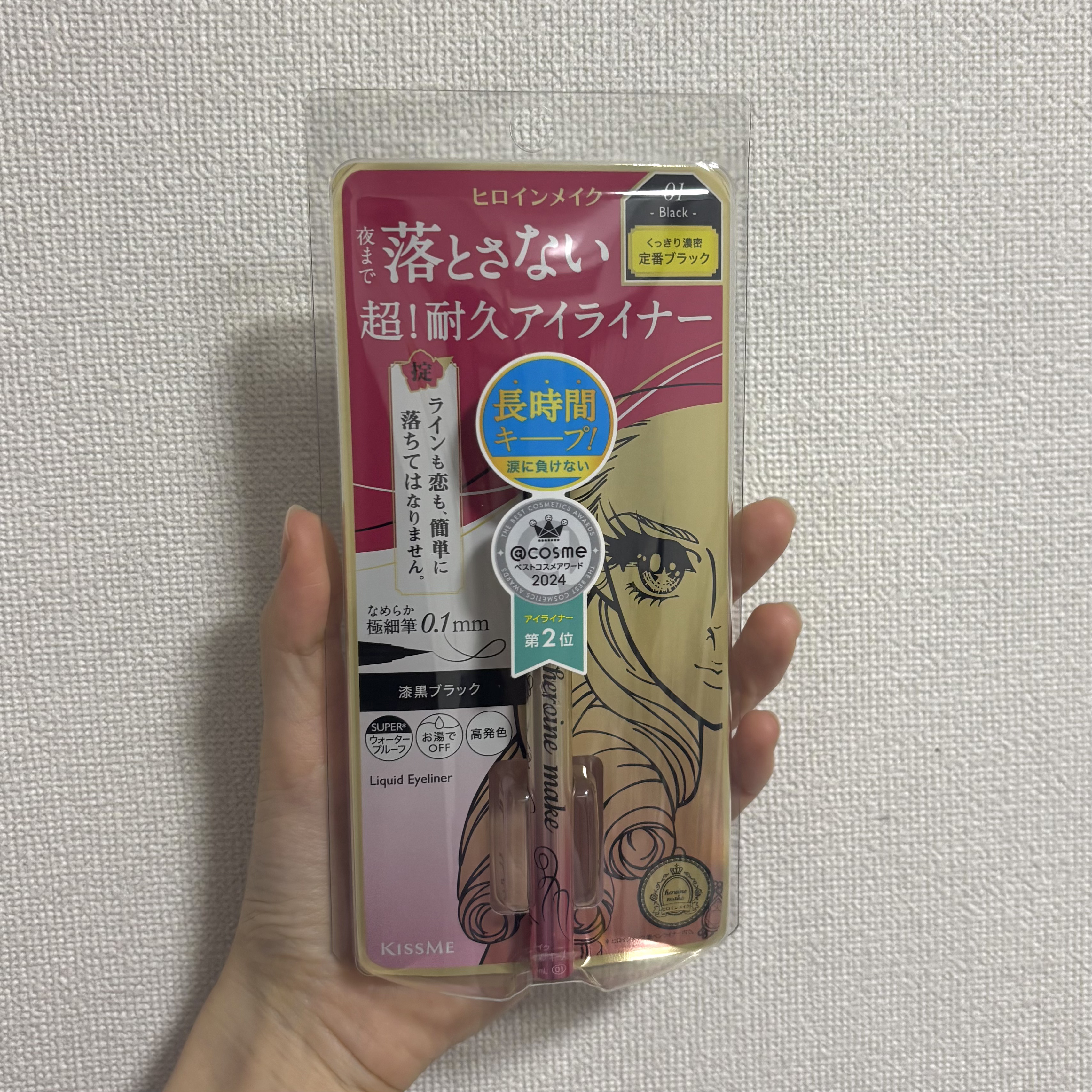 - ヒロイン史上最強※1 夜まで落とさない! 超!耐久リキッドアイライナーが新登場! ■超!耐久 スーパーウォータープルーフ 新耐久性成分と新高密着成分で、ヒロインメイク史上最高※1の耐久性を実現。 涙・汗・皮脂・こすれに強く、1日中※2美しいラインをキープします。 ※1 ヒロインメイク 筆ペンライナー内で。 ※2 日中の活動時間。伊勢半調べ。効果には個人差があります。 ■なめらかな描き心地と高発色 ヒロインメイク初となる新リキッドコントロール機能を採用。 目尻までかすれず、高発色の美しいラインが一気になめらかに描けます。 ■描きやすい!筆先0.1mmの国産極細筆 描きやすさにこだわった、絶妙なコシのある極細筆を採用。 目尻のハネやまつ毛の隙間など、細部まで狙い通りに描けます。 ■染料不使用 染料不使用で肌に色素が残りません。 ■にじまないのにお湯でオフ 高い耐久性でありながら、ぬるま湯で落とせるので日常使いに最適です。 *耐水性が高い処方です。落ちにくく感じる場合は洗顔料(石けん等)をご使用ください。 ■6種類の美容液成分配合 ■抜群の速乾性 速乾性に優れ、メイク中のよれ、にじみに、まばたきにも負けません。
