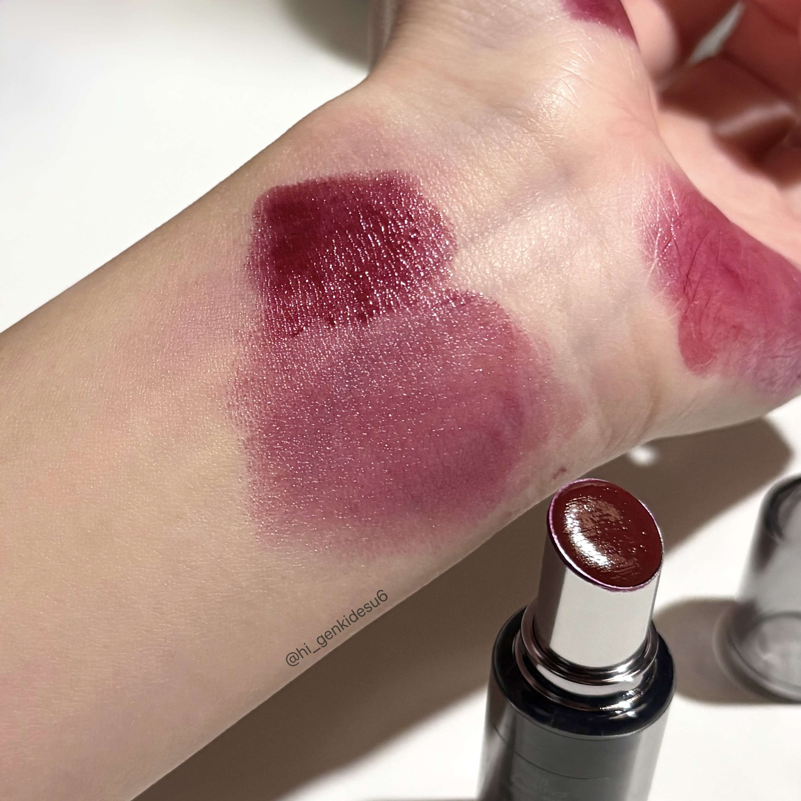ツヤは砂糖を煮つめたシロップみたいな甘〜い光沢感!! 密着力が高いので唇を「んまっ」と擦り合わせてもリップが動きにくい。 このティントはツヤも綺麗ですしカラバリも豊富で、沢山持っているリップの中でも一軍です👍🏻