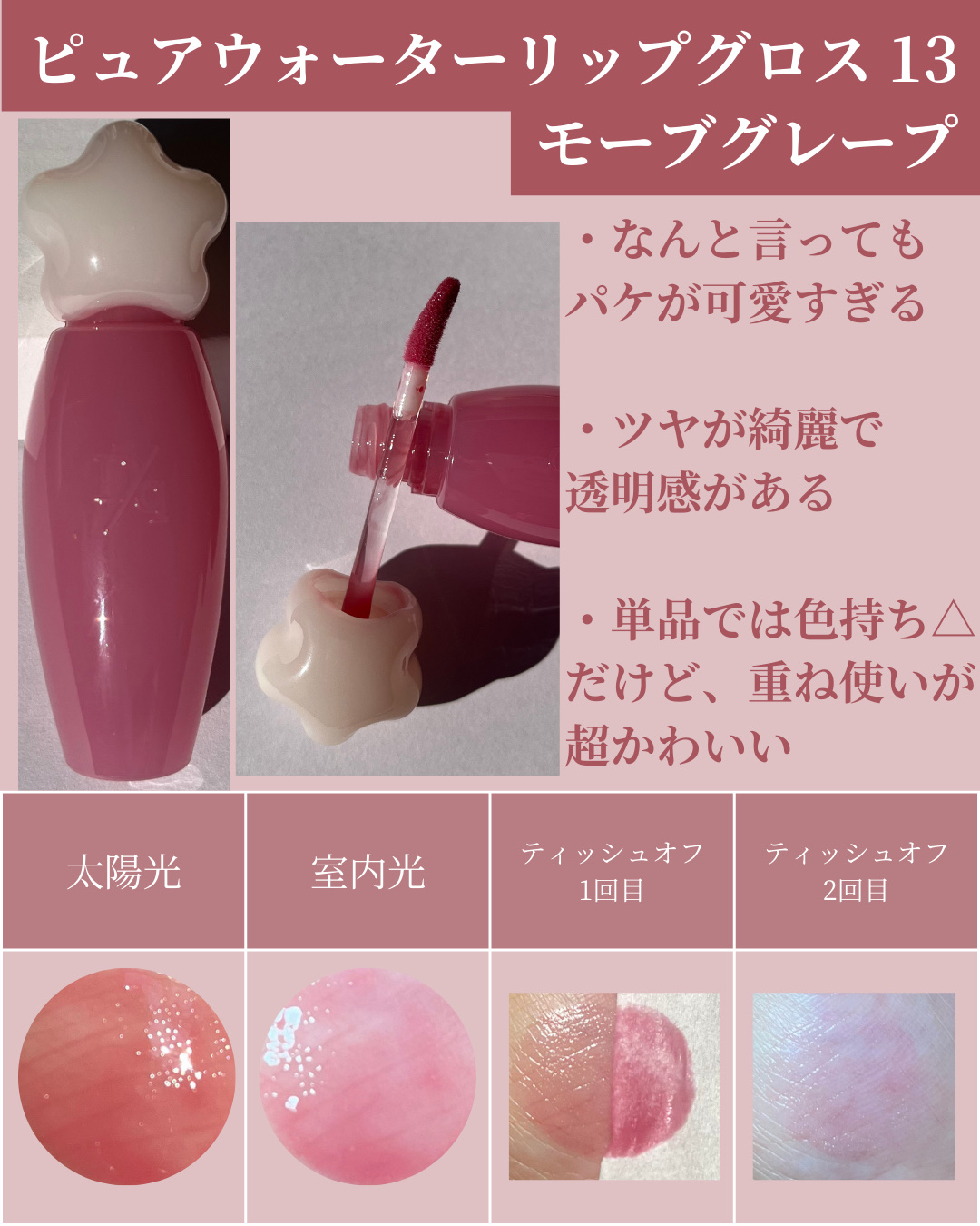 | リップグロスランキング第48位 | ぷるんっとした唇になってくれる🎶 ベタっとしてなくて重くないサラサラテクスチャなのもすき💓💞 | 詳細を見る | |