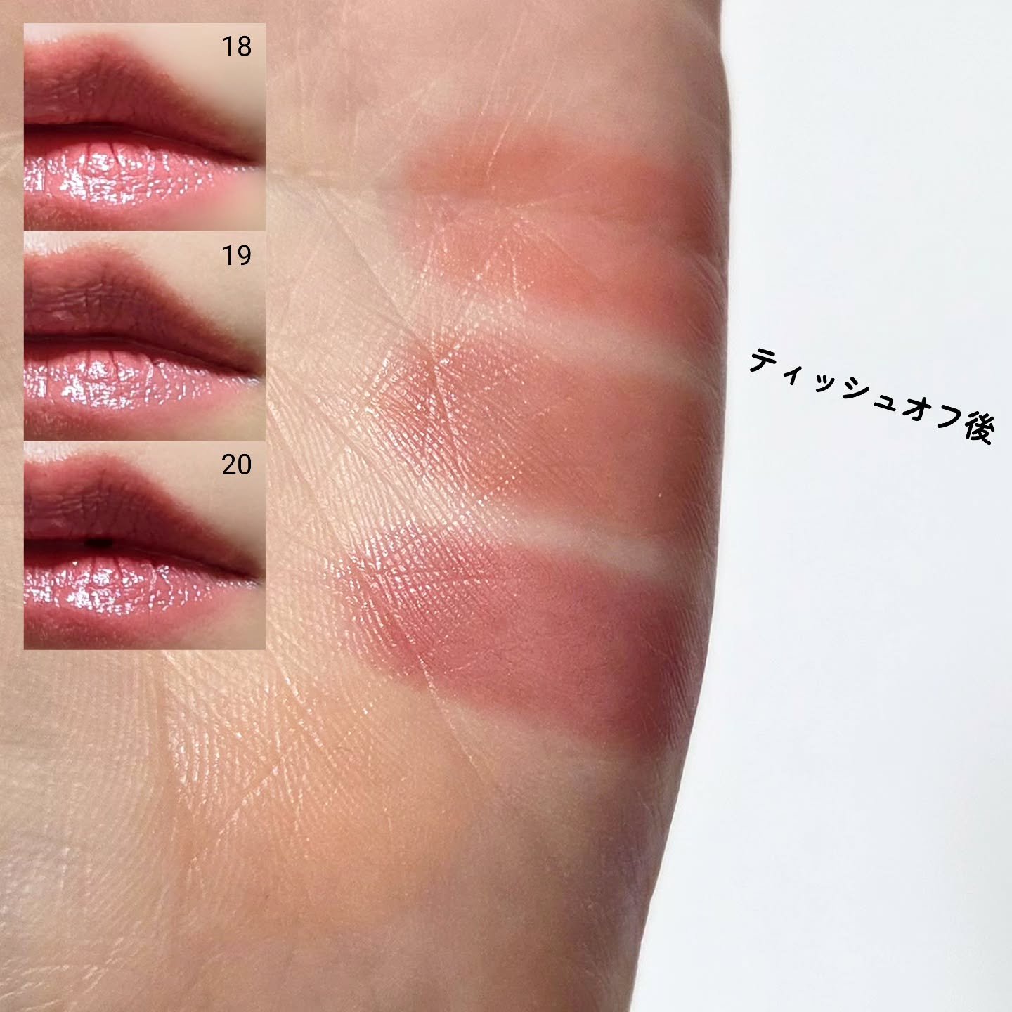 プランプ効果はないのに唇の縦ジワが目立ちにくくなってぷっくりつやんとした仕上がりになるからめちゃ可愛い🥹💕 今回のシリーズは春向きの落ち着いたピンク系カラーでブルベ夏の私にはしっくりくる大好きな3色でした。 蓋を回さずに上に外すとシリコンが出てくるのでそこでぼかして使えます。