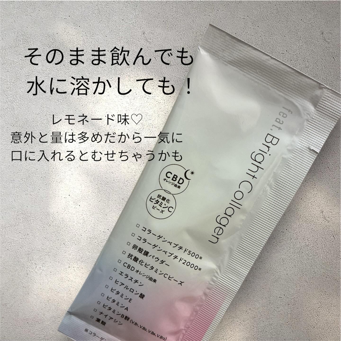 飲む、うるおい+透明感。 ▶feat. Bright Collagen 1日1~2包を目安に粉末のまま飲むか、水に溶かして飲んでください! 個人的には1日2包、水なしで飲んでいます。 レモネード味でほどよい酸っぱさがクセになる! 個包装だから持ち運びがしやすいので、いつでもどこでもキレイ習慣を✨️