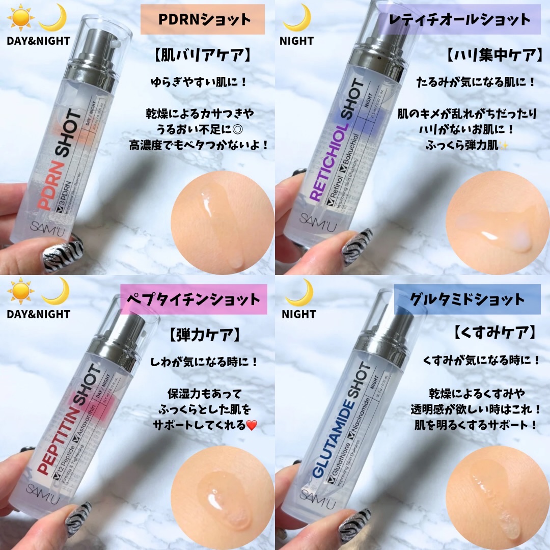 サミュのアンバサダー投稿です。今回ご紹介するのはこちら💁♀️2in1の高機能セラム。二層式になっていて、カチッと振ってから使うセラムです。肌悩みに合わせて使えるよ!♥グルタミドショット→くすみケア♥レティチオールショット→ハリ集中ケア♥PD...