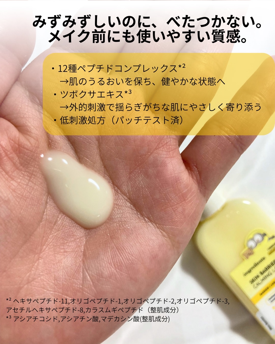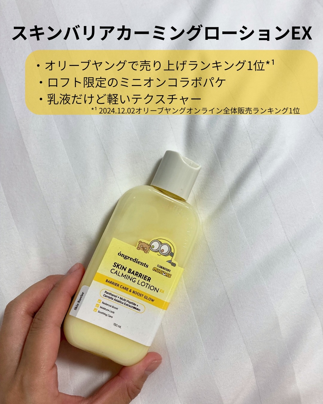 - 「ongredients(オングリディエンツ)」が、ついに日本のオフライン店舗に登場! <2025年8月30日(土)(※1)より全国のプラザ、ドン・キホーテ(※2)にて先行販売を開始> メイクノリが上がるツヤ肌乳液 【主要成分】 ・オリオソームTECA(※3) ツボクサ由来成分(※3)をオリオソーム技術で包み込み、肌に馴染みやすい設計にすることで、外的刺激を受けた肌を落ち着かせます。 ・複合ペプチド(※4)&ヴィーガンコラーゲン(※5) 肌コンディションを整え、内側から輝くようなツヤ肌を演出します。 ・パンテノール(※6) 角質層まで浸透(※7)し、うるおいのある肌印象へと導きます。 【こんな方におすすめ】 ・ツヤ感のあるメイクを好む方 ・水分感のあるツヤ肌を目指したい方 ・外的刺激によりゆらいだ肌を労わりたい方 (※1)店頭開始日となり、購入可能日は各店舗により異なります。 (※2)一部店舗を除きます。 (※3)アシアチコシド,アシアチン酸,マデカシン酸(整肌成分) (※4)ヘキサペプチド-11,オリゴペプチド-1,オリゴペプチド-2,オリゴペプチド-3,アセチルヘキサペプチド-8,カラスムギペプチド,トリペプチド-1銅,パルミトイルヘキサペプチド-12,パルミトイルペンタペプチド-4,パルミトイルテトラペプチド-7,パルミトイルトリペプチド-1,トリペプチド-1 (※5)ハイビスカスコラーゲンから抽出した加水分解コラーゲン(整肌成分) (※6)保湿成分 (※7)角質層まで