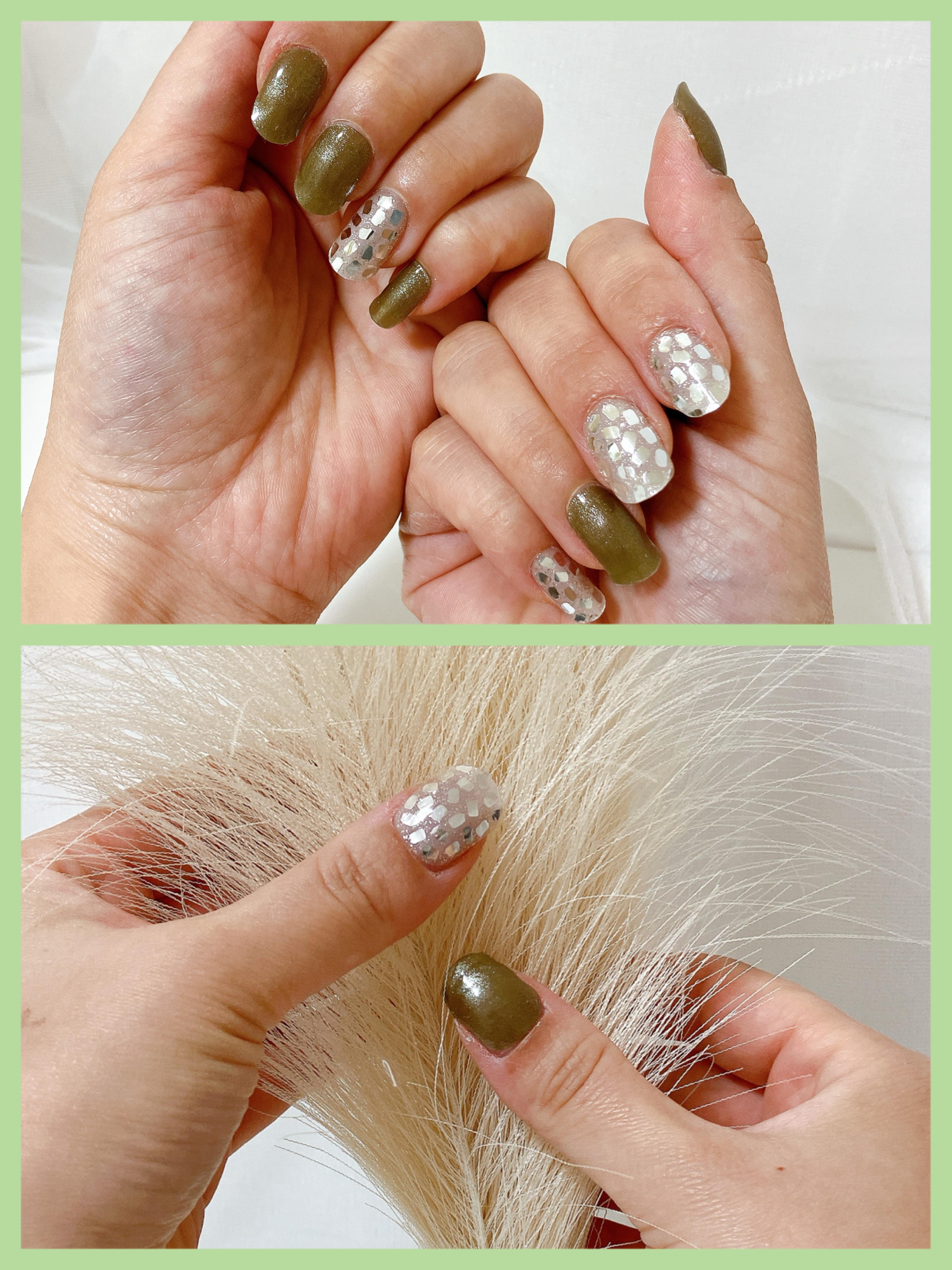 ohora❤️ネイルシール(NP-049-JNShizukuApple/ND-116-JNOliveGlow)GelLamp💚貼って固めるだけで、まるでサロンで仕上げてもらったみたいなツヤ感に。時間がない日でも、さっと貼ってライトを当てるだけ...