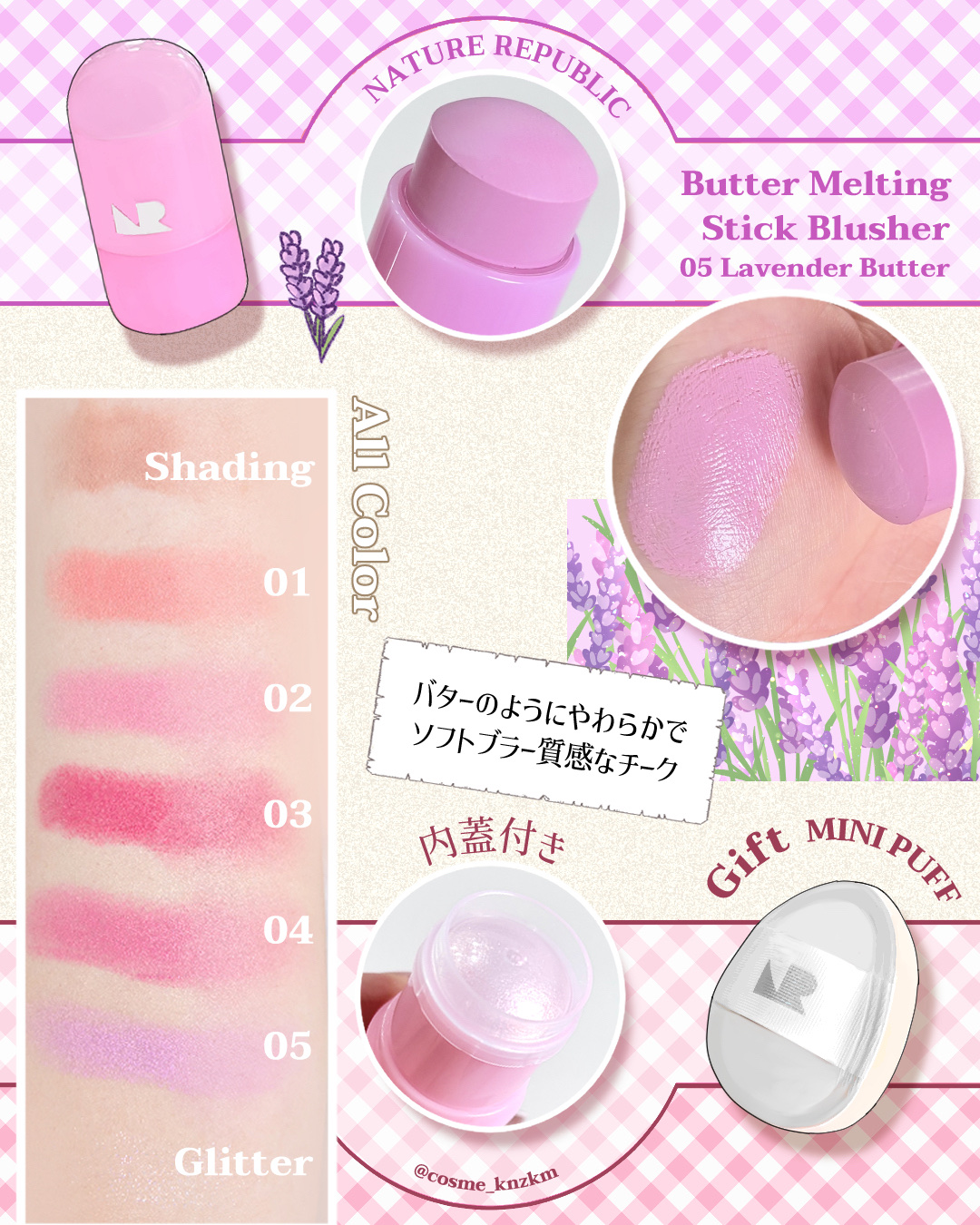ネイリパから新作チーク登場☁️✧ネイチャーリパブリックメルティングスティック(7種)【バターメルティングスティック】ブラッシュ(全5色)01ピーチバター02ベリーバター03トマトバター04ライチバター05ラベンダーバターソフトなテクスチャーで...
