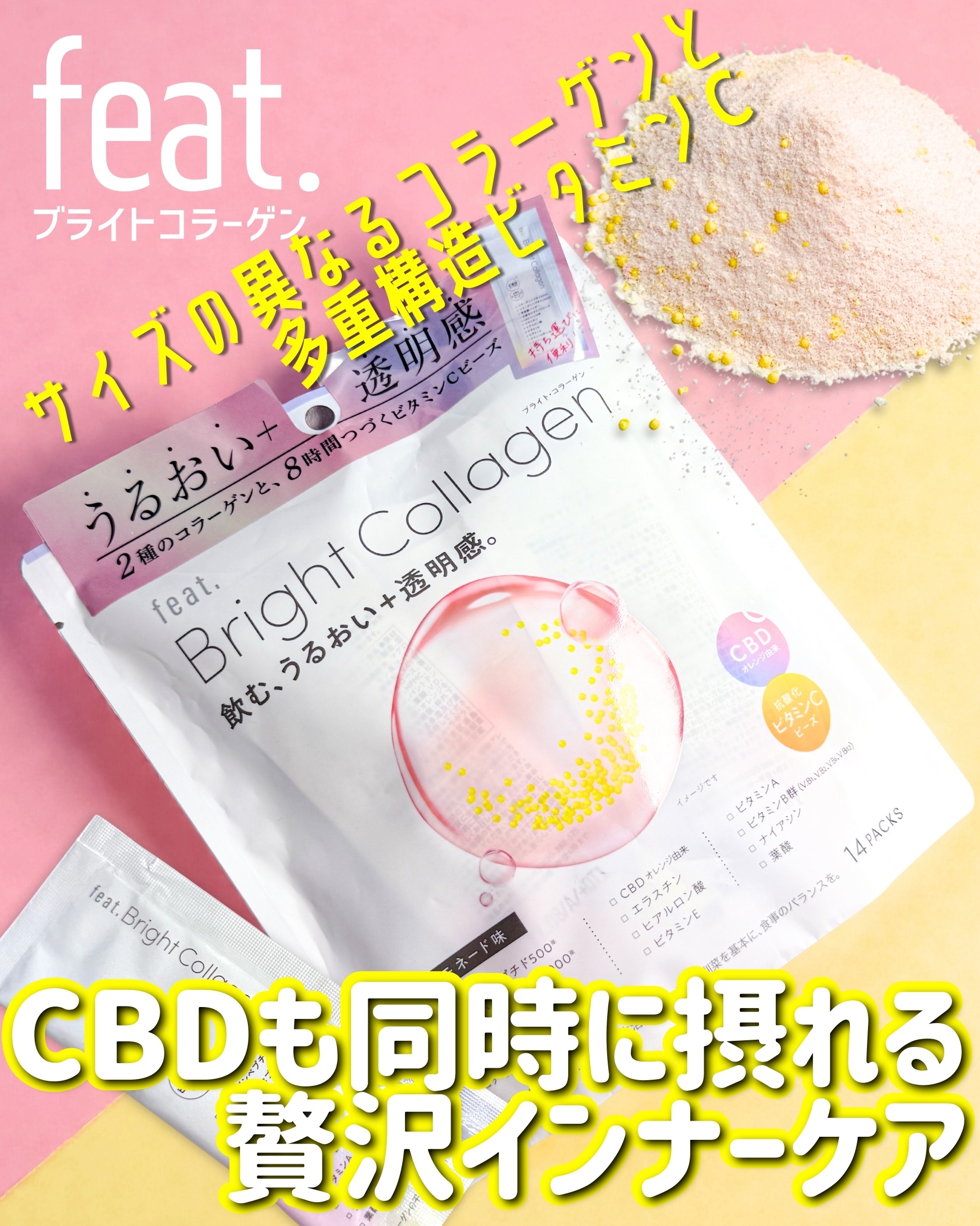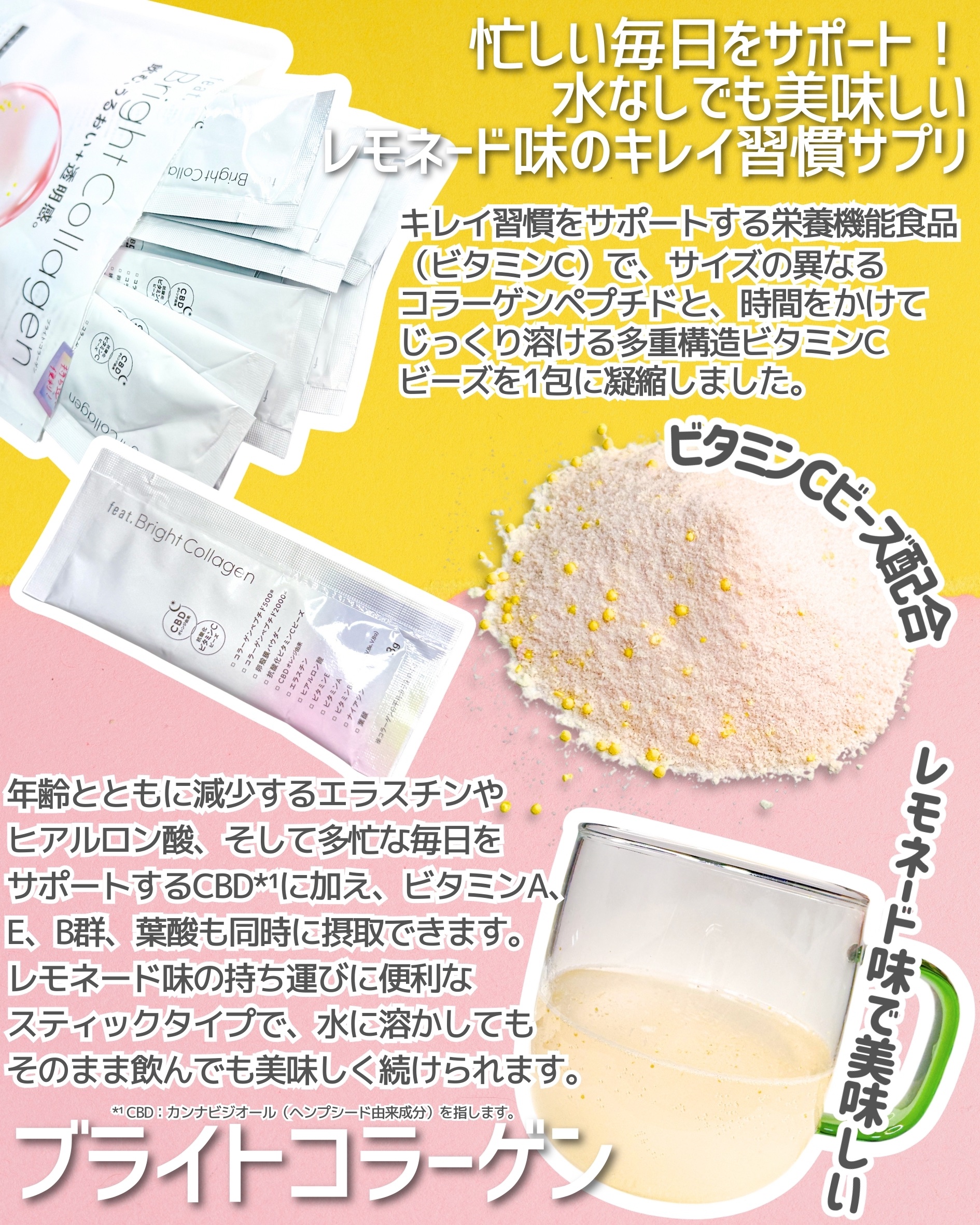 Feat.ブライトコラーゲンを使用しました😊サイズの異なるコラーゲンペプチドと、時間をかけてじっくり溶ける多重化構造ビタミンCビーズを1包に詰め込んだ、キレイ習慣をサポートする栄養機能食品です。多忙な毎日をサポートするアメリカで話題のCBDを...