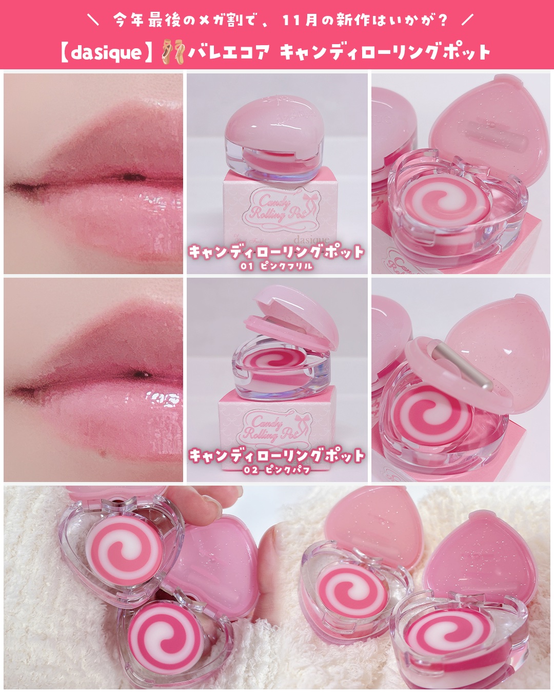 #PR#dasique見た目も中身もかわいい❤︎デイジークのバレエコアコレクション🩰🏰『キャンディローリングポット』は、ぐるぐる模様のツヤぷるバーム🍭唇の上でなめらかに広がるタッチが心地よく、ジュワッと透けるような艶やか仕上げ💫ピンク×ホワイ...