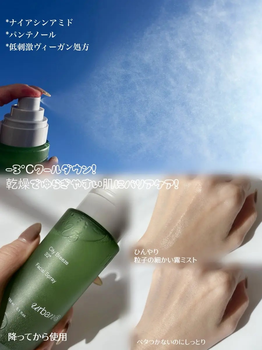 アーバンアンドさんに「シティブリーズ32度フェイシャルスプレー」をいただきました。熱をもった肌を優しく整えてくれるクールダウンミスト。肌温度が平均3℃下がったという臨床結果もあるそう。整肌成分のナイアシンアミドが配合されていて、肌のトーンケア...