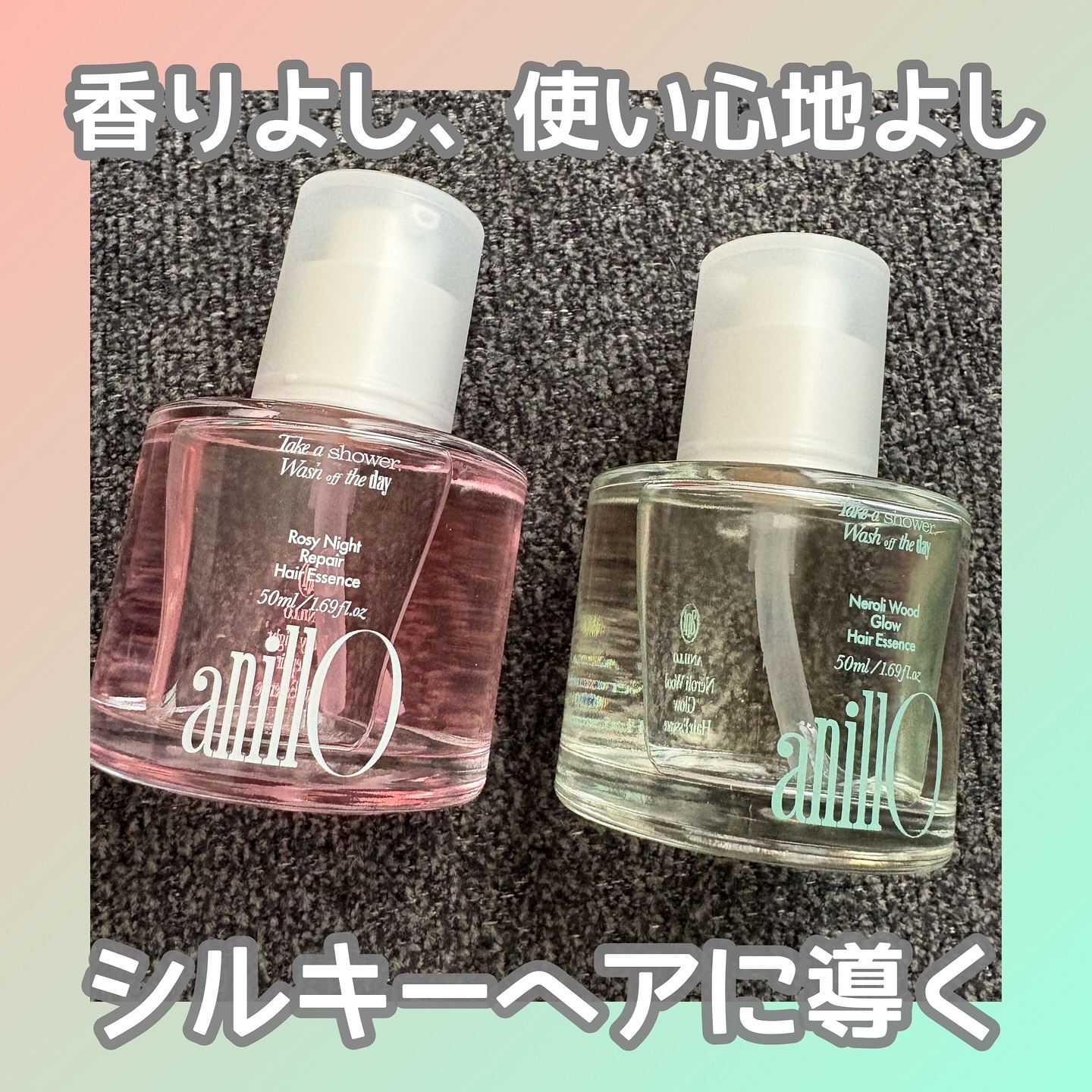 香りまで“褒められる髪”にしたいならanilloが優勝🏆 軽いのにしっとりまとまってふんわり香りが続くヘアエッセンス♡💚ネロリウッド(軽やかツヤ系) ネロリ×ホワイトフラワーの上品な香り。 カラー後のパサつき髪にも◎❤️ロージーナイト(しっと...