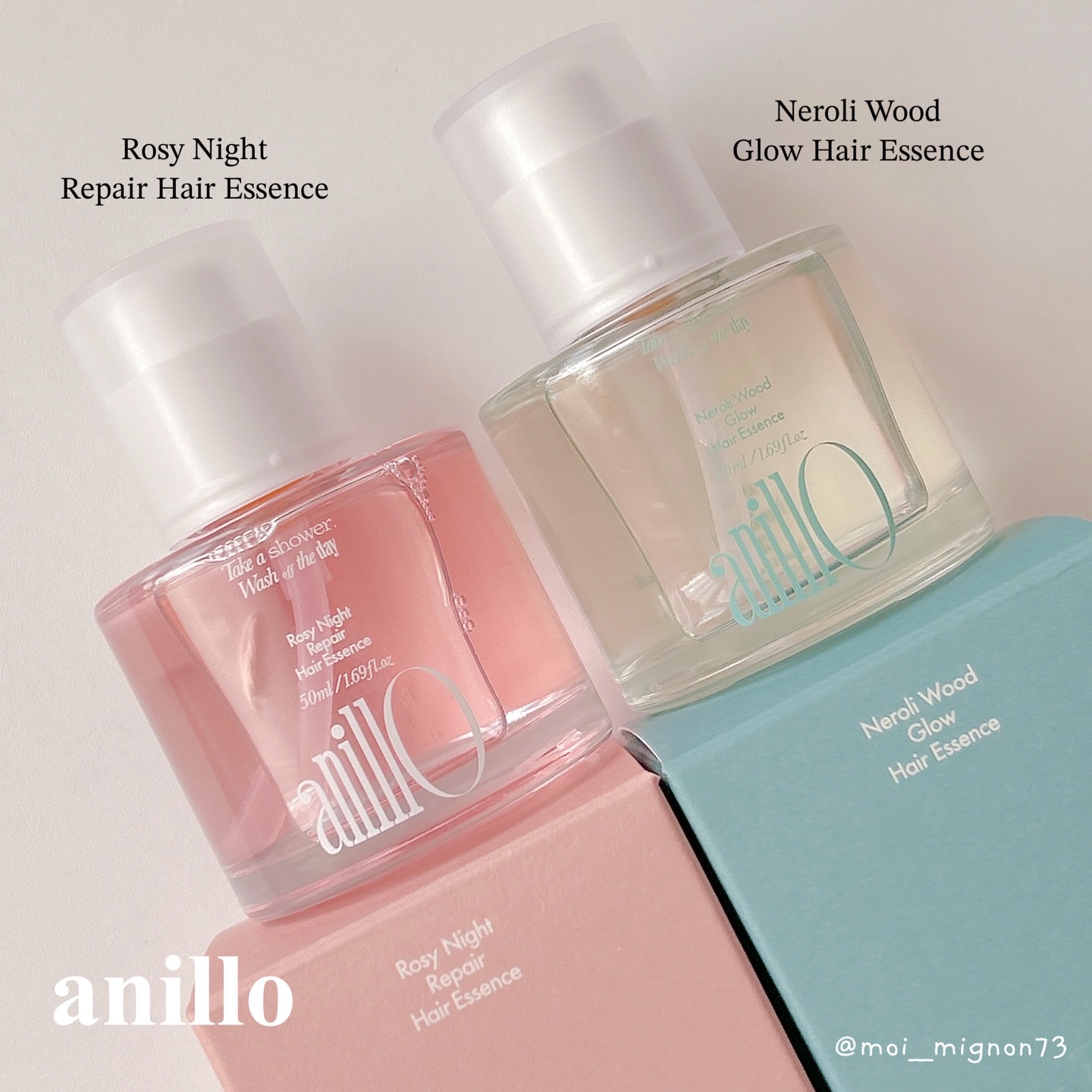 香りまで“褒められる髪”にしたいならanilloが優勝🏆 軽いのにしっとりまとまってふんわり香りが続くヘアエッセンス♡💚ネロリウッド(軽やかツヤ系) ネロリ×ホワイトフラワーの上品な香り。 カラー後のパサつき髪にも◎❤️ロージーナイト(しっと...