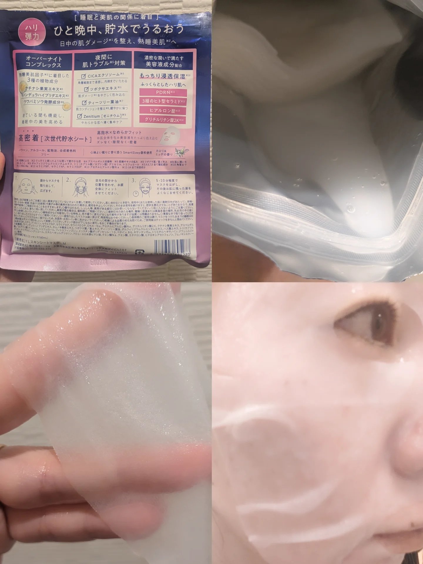 - [ 睡眠と美肌の関係に着目 ] ひと晩中、貯水でうるおう 翌朝、もっちり肌へ ■オーバーナイトコンプレックス 熟睡美肌因子※1 に着目した3種の植物成分:クチナシ果実エキス※2、ラバンデュラハイブリダエキス※2、ウワバミソウ発酵成分※3 寝ている間も機能し、睡眠中の美を高める ■夜間に肌トラブル※4 対策 ・CICAエクソソーム※5:角層細胞まで浸透し、内側までいたわる ・ツボクサエキス※5:肌ダメージ※6 をやさしく包み込む ・ティーツリー葉油※7:肌コンディションを整え※8、健やかに保つ ・Zenitium [ ゼニチウム ]※9:やわらかな肌へ導く集中ケア ■濃密な潤いで満たす美容液成分配合 もっちり浸透保湿※10 ふっくらとしたハリ肌へ PDRN※11、3種のヒト型セラミド※12、ヒアルロン酸※13、グリチルリチン酸2K※14 ■高密着 [ 次世代貯水シート ] 高抱水×なめらかフィット お肌全体を包み美容液をたっぷり抱え込む ズレなく・隙間なく・密着 ■心地よい眠りに寄り添う SmartSleep香料使用 ネロリ&ミュゲの香り パラベン、アルコール、鉱物油、合成着色料 フリー ※1 ぐっすりと眠ったような潤って艶やかな肌 ※3 アスペルギルス培養物 ※4 乾燥やキメの乱れ ※5 ツボクサ葉/茎エキス ※6 乾燥による ※8 肌に潤いを与えること ※9 ポルフィリジウムクルエンタムエキス、トリ(カプリル酸/カプリン酸)グリセリル、トコフェロール ※2,3,5,7,9 全て整肌成分 ※10 角層まで ※11 DNA-Na ※12 セラミドNP、セラミドAP、セラミドEOP ※13 アセチルヒアルロン酸Na ※11-14 全て保湿成分